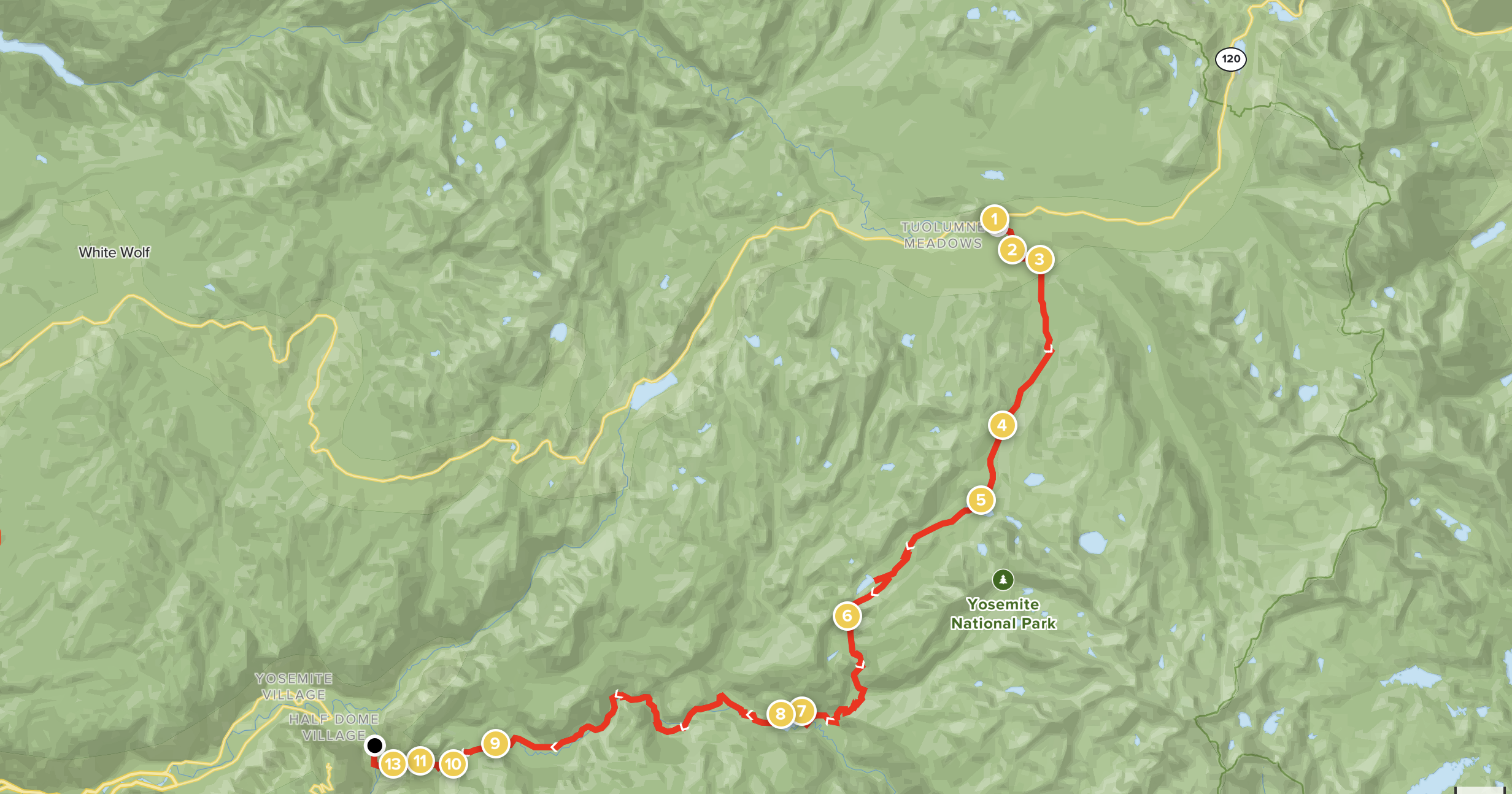 We went to bed that night not having made a decision, which would soon get made for us as our strategically hung food turned out to be a tedious, but ultimately rewarding exercise for a medium sized bear who subsequently ate all of our provisions, including the toothpaste. It’s disturbing and a little frightening to be out in the middle of nowhere without any help nearby as you wait for the bear to finish its work. But sleep eventually came and we arose the next morning a little tired and a lot hungry to break camp in order to make a hurried six-mile descent to the valley where we could find food. We camped a couple of nights more in the walk-in campground behind North Pines Campground, enjoying hot showers and food we didn’t have to cook.