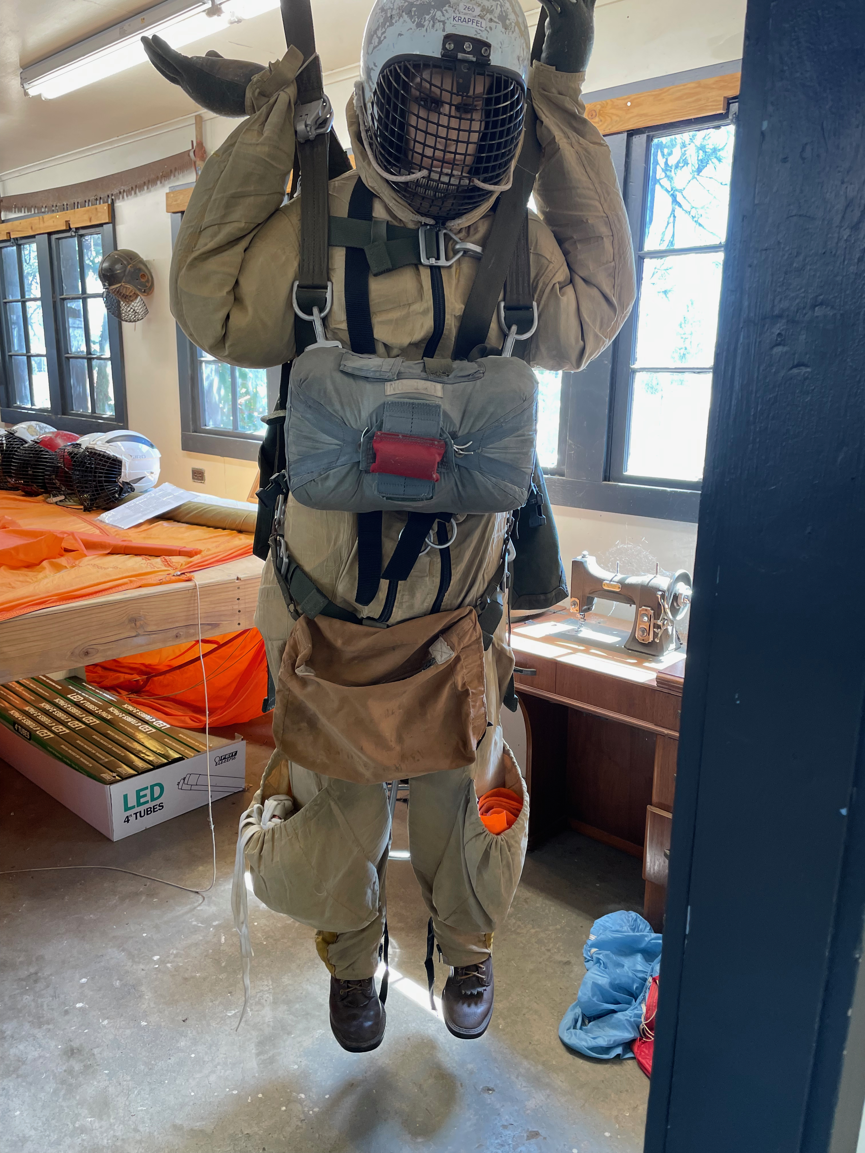 In the oldest existing parachute loft in the United States, we viewed the equipment used by the smokejumpers, including various parachutes, firefighting gear, the protective clothing that was worn and sewing machines. Throughout the history of this base, there were many sewing machines needed to repair parachutes. As many as 17 machines of different sizes were in operation at this base’s parachute loft, most of which were Singer Sewing Machines. The Singer Company noted this fact in an article that featured the Siskiyou Smokejumper Base in a 1956 edition of their company magazine.