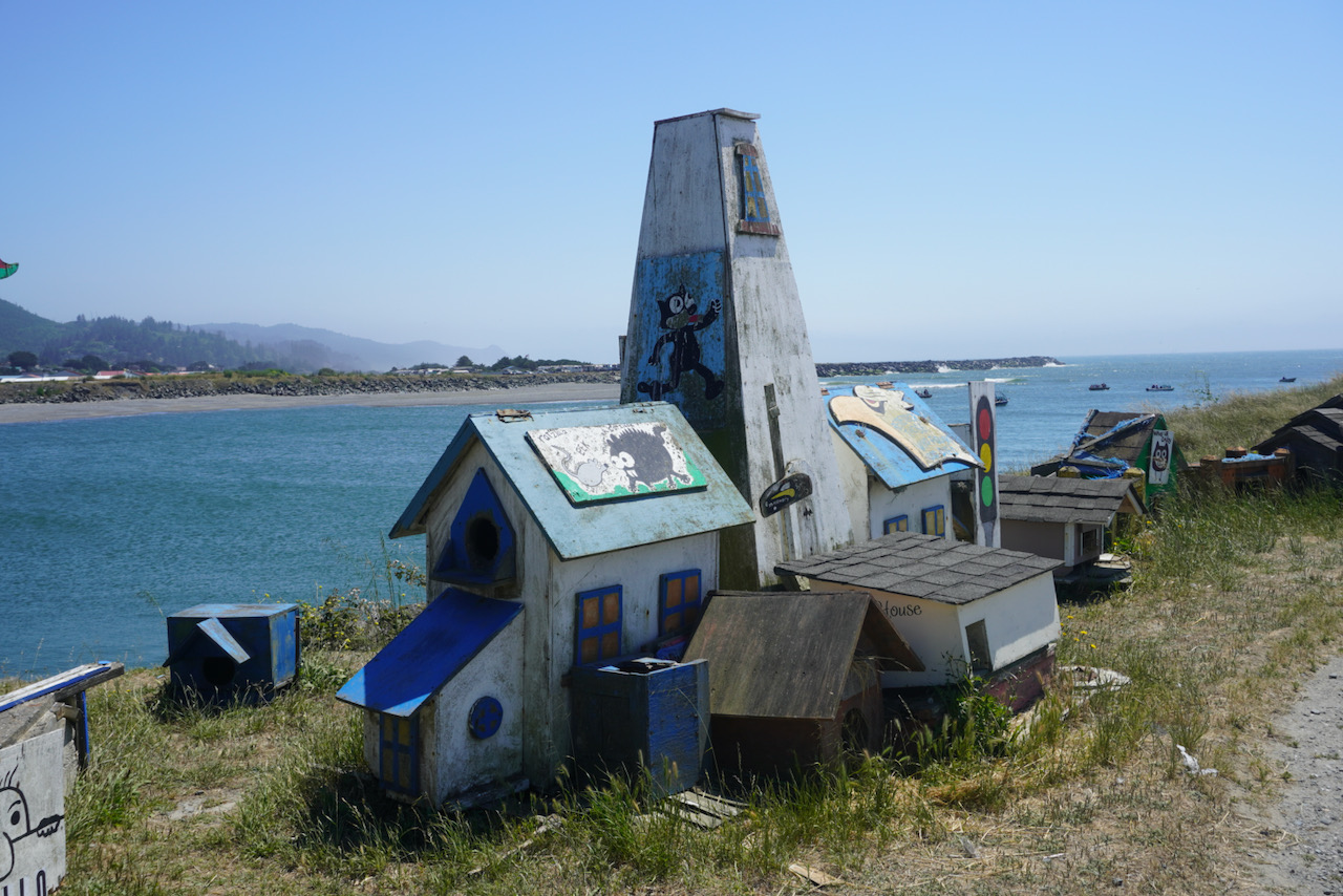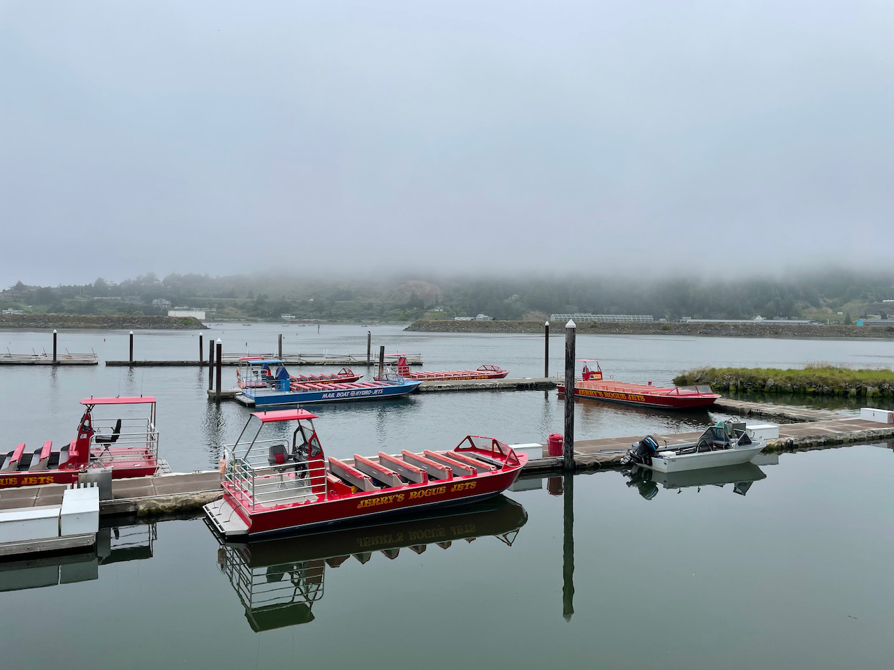 Too early to check in to the Pacific Reef Hotel, our home for the next two nights, a nice complex on Highway 101, we drove north through town to the mouth of the Rogue River, stopping briefly to locate the launch point for Jerry’s Rogue Jets, our planned adventure for the next day. Crossing the bridge over the river, we pulled off on a stretch of sand to watch boats going in and out of the harbor and noted a collection of small houses, which we later learned were for the local cat population.