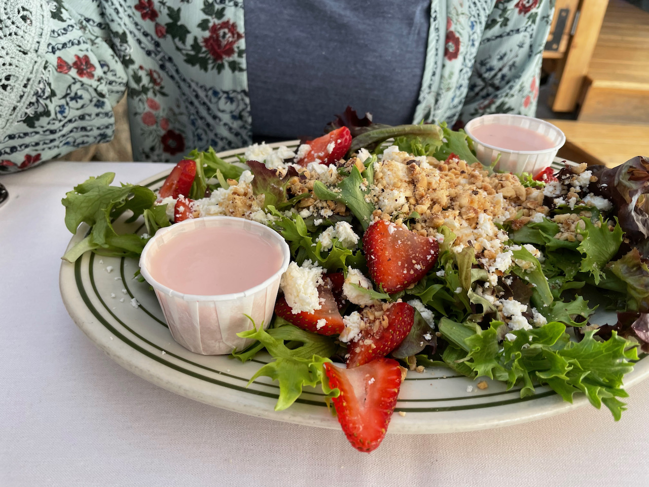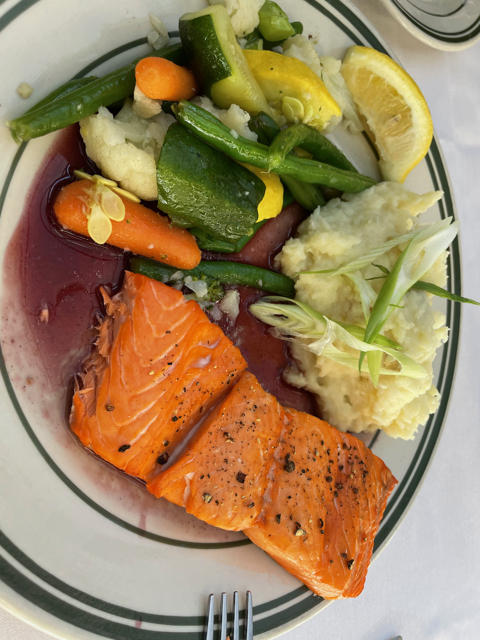 This being the heart of salmon country, it would have been a sin not to order it, so I selected the Cedar Planked Local Wild King Salmon Ssrved with Old Vine Zinfandel Sauce, garlic mashed potatoes and mixed vegetables, while Joanna got the chef’s seasonal salad which highlighted local in season strawberries. All in all, it was a fine meal, the salmon the real deal and with just a couple of drinks consumed (at under $10 apiece), the tab came to $75 including tip, a bargain by big city standards.