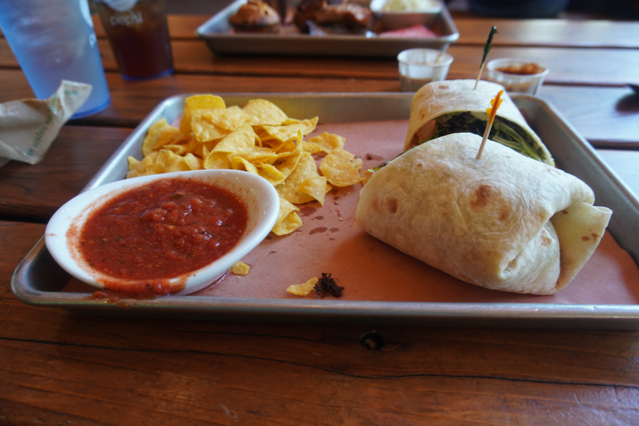 It’s a big modern facility catering to those coming in off the river and others who might drive in from the coast. I ordered one beer to tide me over and for food, Joanna went for the BBQ Plate (Ribs, Pulled Pork, Brisket, Muffin, Baked Beans, & Coleslaw) while I opted for the Veggie Wrap (Hummus, cucumber, tomato, carrots, mixed greens, and avocado), far more food than either one of us could consume in one sitting. The wrap would return with us, its garlicky odor lacing our cooler for the next day or so.