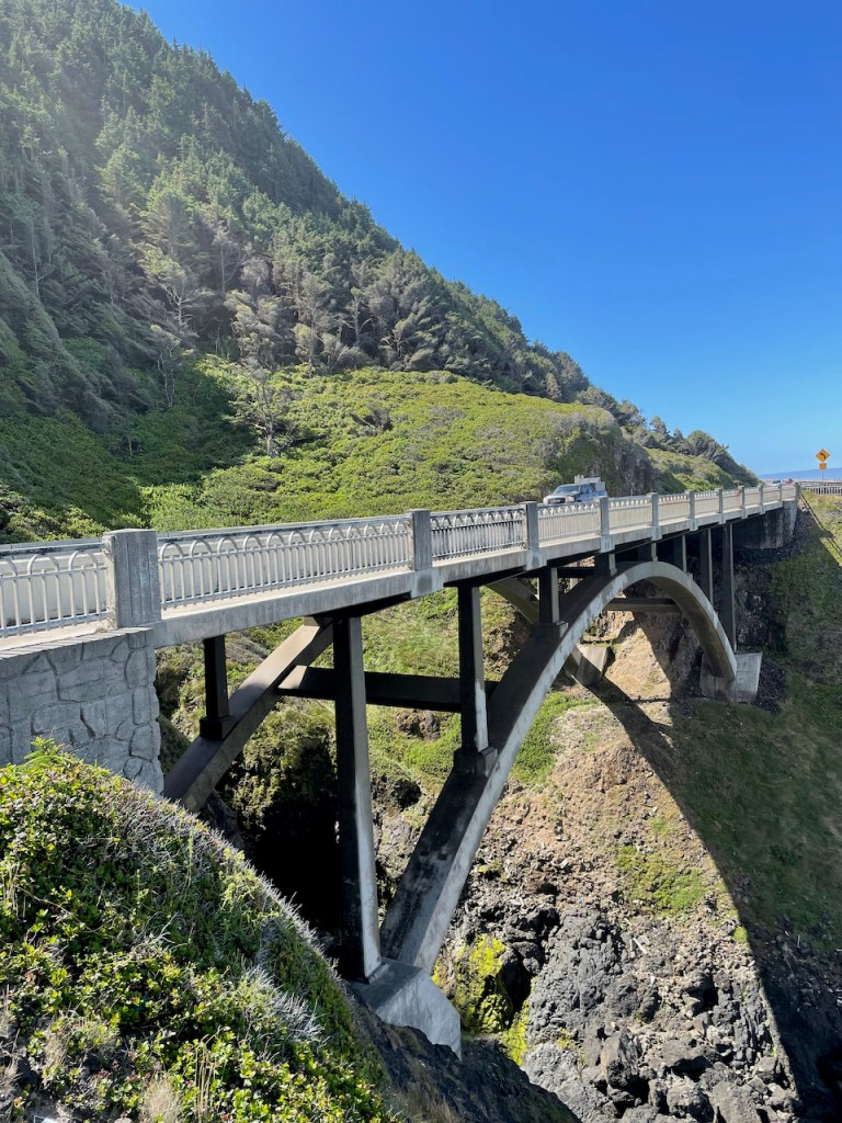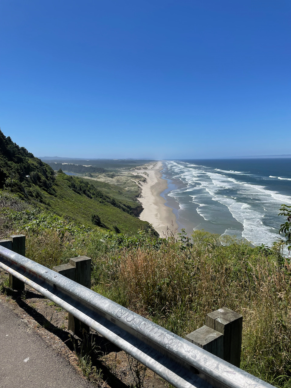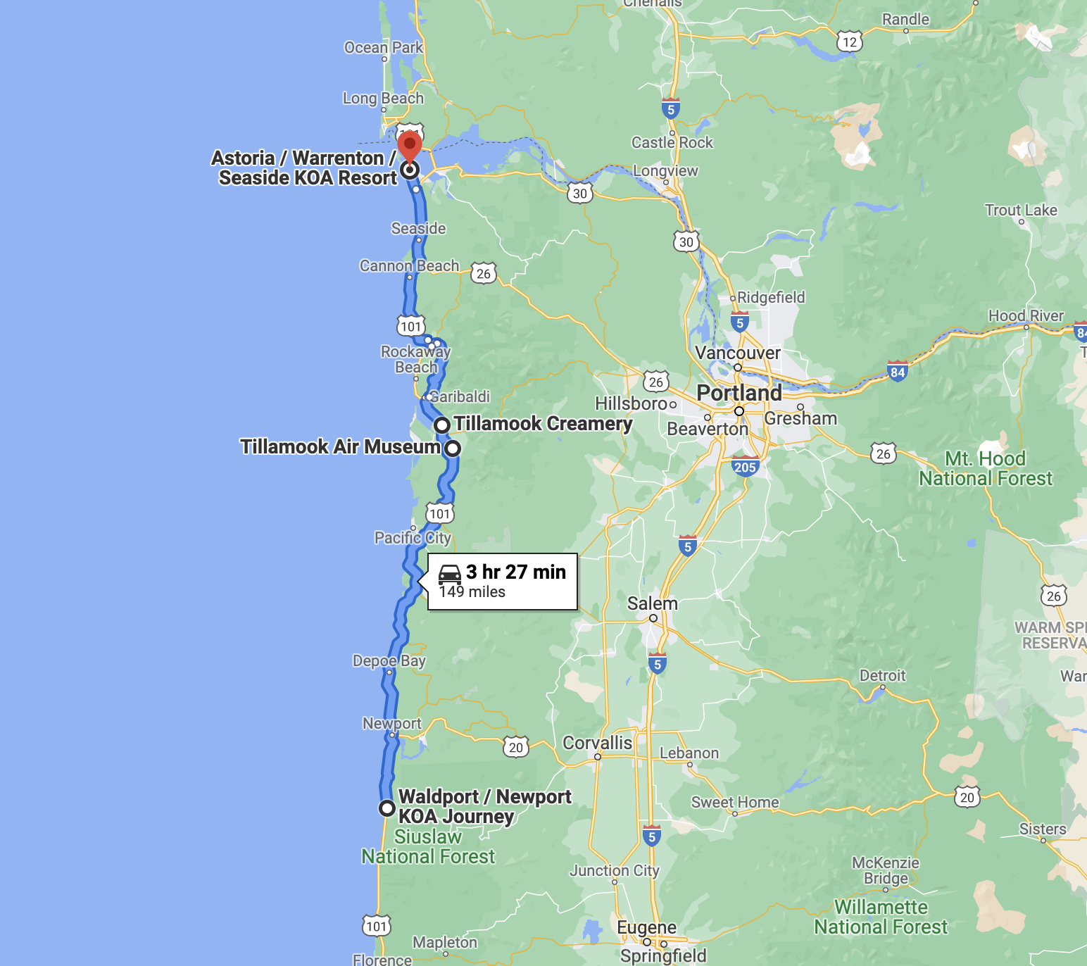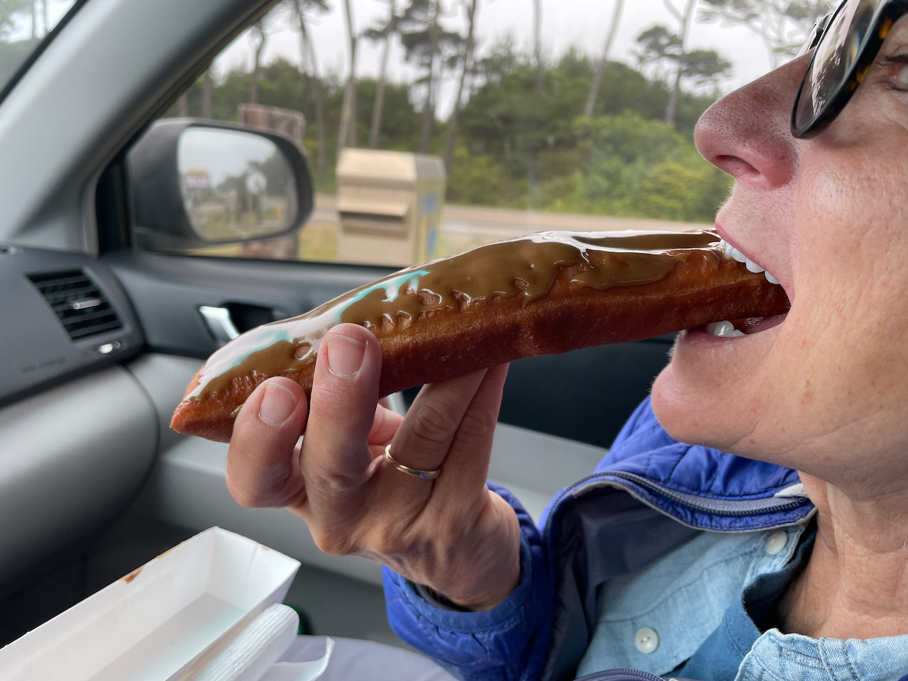 The tab came to a reasonable $48 including tip and we left full and satisfied, happy to close out our time in Waldport and ready to move on north. That next morning, we broke camp and started our drive, hoping to find a coffee and pastry somewhere along the road. We were rewarded when Joanna discovered Seal Rock Expresso in Seal Rock, where we waited patiently in line to get a large vanilla latte and one of the biggest maple bars we’ve ever encountered.