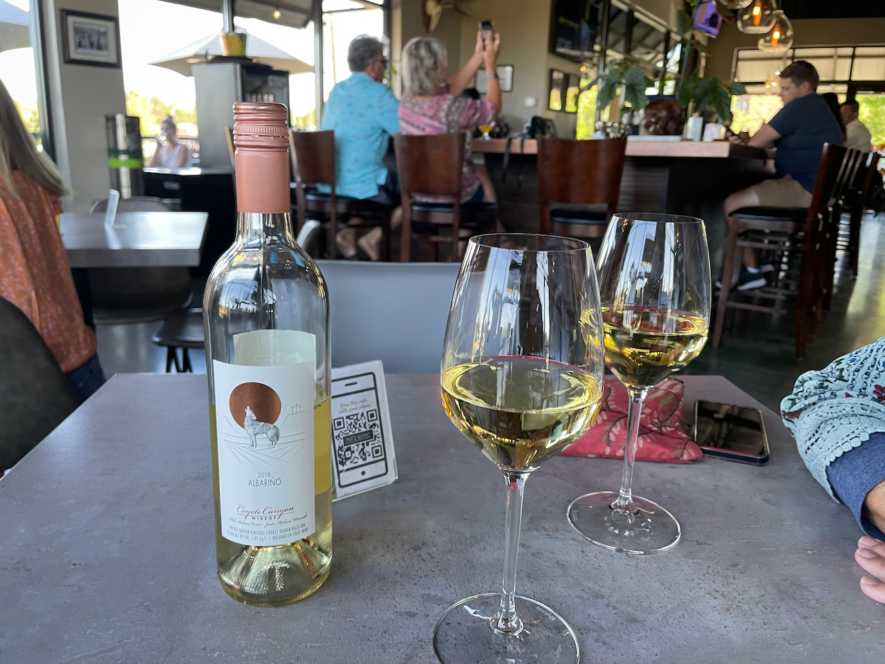 We unpacked, had a cold one and then drove a short distance to Tri Cities Tap and Barrel, a recommendation of Guillermo’s. A single storefront wide with bountiful outdoor seating, we opted to sit inside as it was very warm outside. Approached by our waitress, we ordered a bottle of Albarino from Coyote Canyon Winery, a local concern about 30-miles away in Prosser. The wine was delightful, and we would seek it out, unsuccessfully down the road, as it starts off with tricky sweet fruit flavors and then gives way to a clean crisp finish.