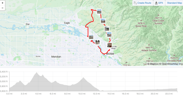 I once again used Ride with GPS to locate a 25-mile ride that just so happened to pass by the condo as it headed up Bogus Basin Road. We set out with good intentions only to discover that we would be climbing almost 1,000 feet in less than four miles, a stiff challenge that makes one question the wisdom of riding bikes in the first place.