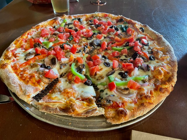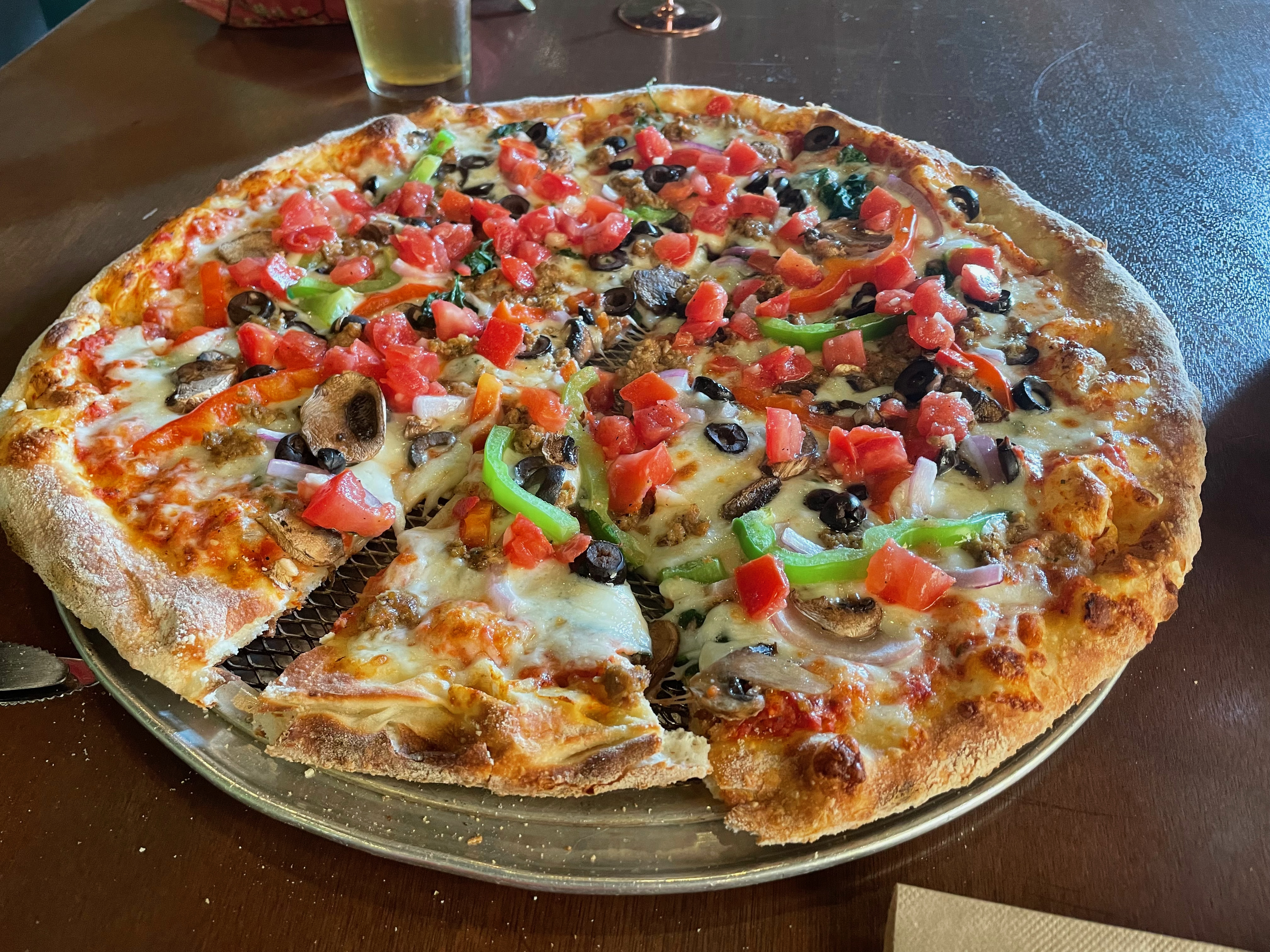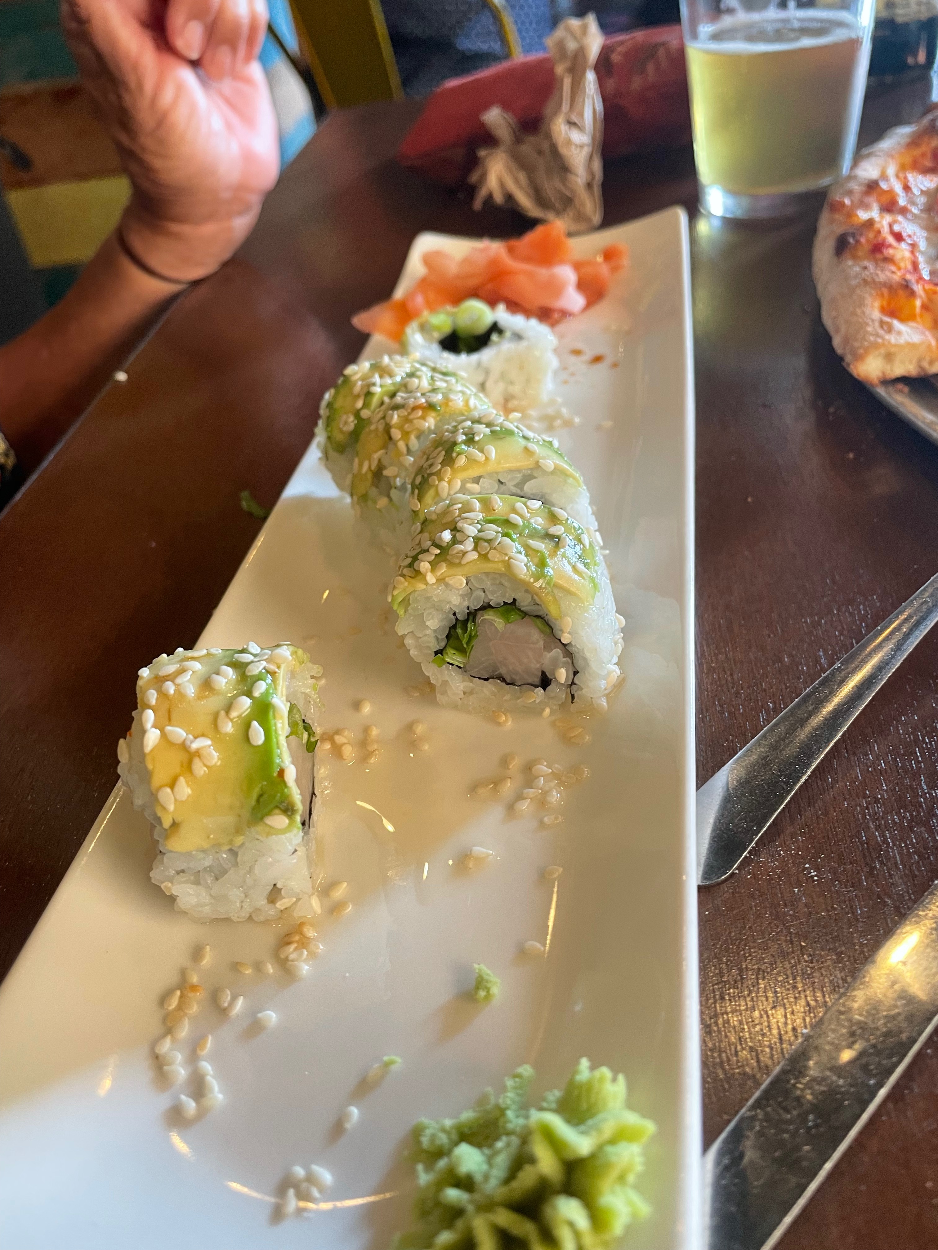 We finished up our visit, having done a thorough job as tourists and now very hungry, stopped a block or two away from the condo at Lulu’s Pizza & Sushi, a recommendation from Cathy and Tony. We ordered a couple of local craft beers, a Lulu’s Supreme Pizza (house tomato sauce, Italian sausage, sliced mushrooms, garlic spinach, chopped basil, red onions, fresca tomatoes, green and red peppers, black olives, parmesan oregano blend, and mozzarella) and knowing we had a refrigerator in which to store leftovers, a full order of the California Roll.