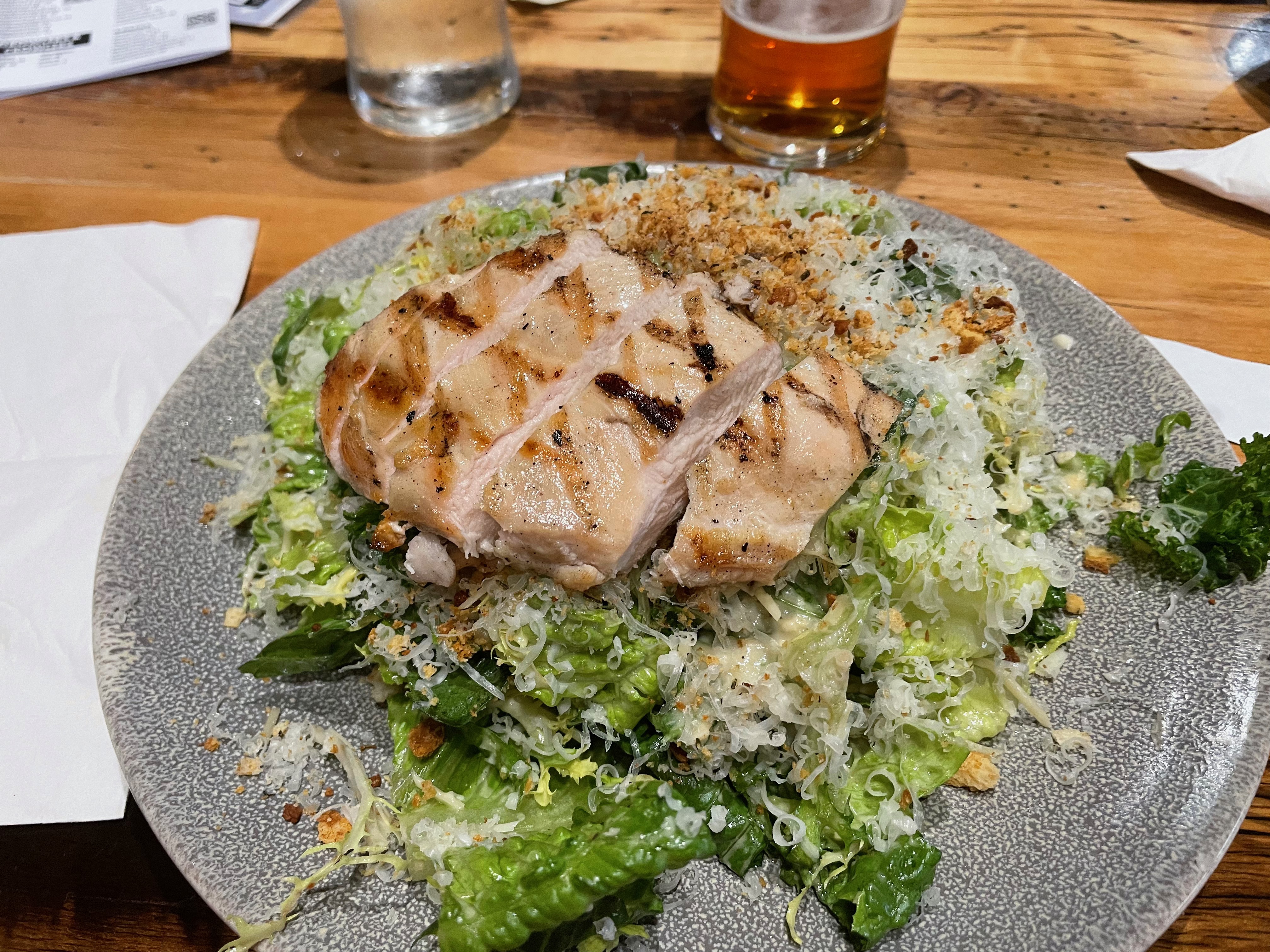 At 20-ounces apiece they kept us hydrated through our meal, which was a Bulgogi Bowl (Marinated grilled chicken thigh, farro, peanut butter yum yum, avocado, roasted red peppers, cumin lime cabbage, cilantro, and black sesame seeds) for Joanna and a Chicken Caesar Salad (Citrus Caesar dressing tossed w/romaine and frisee, fresh grated manchego cheese, powdered anchovies, and crouton sprinkle) for me.