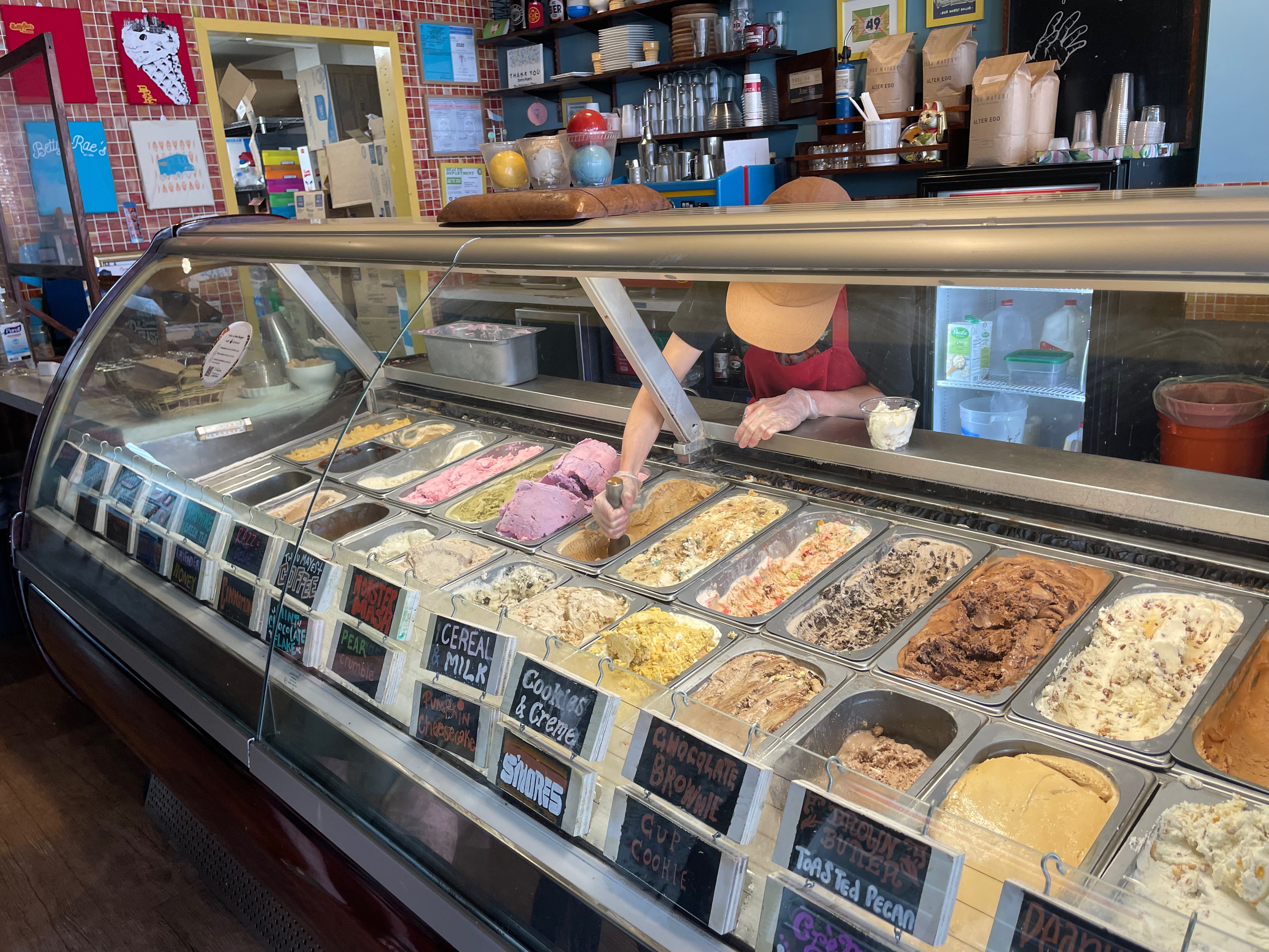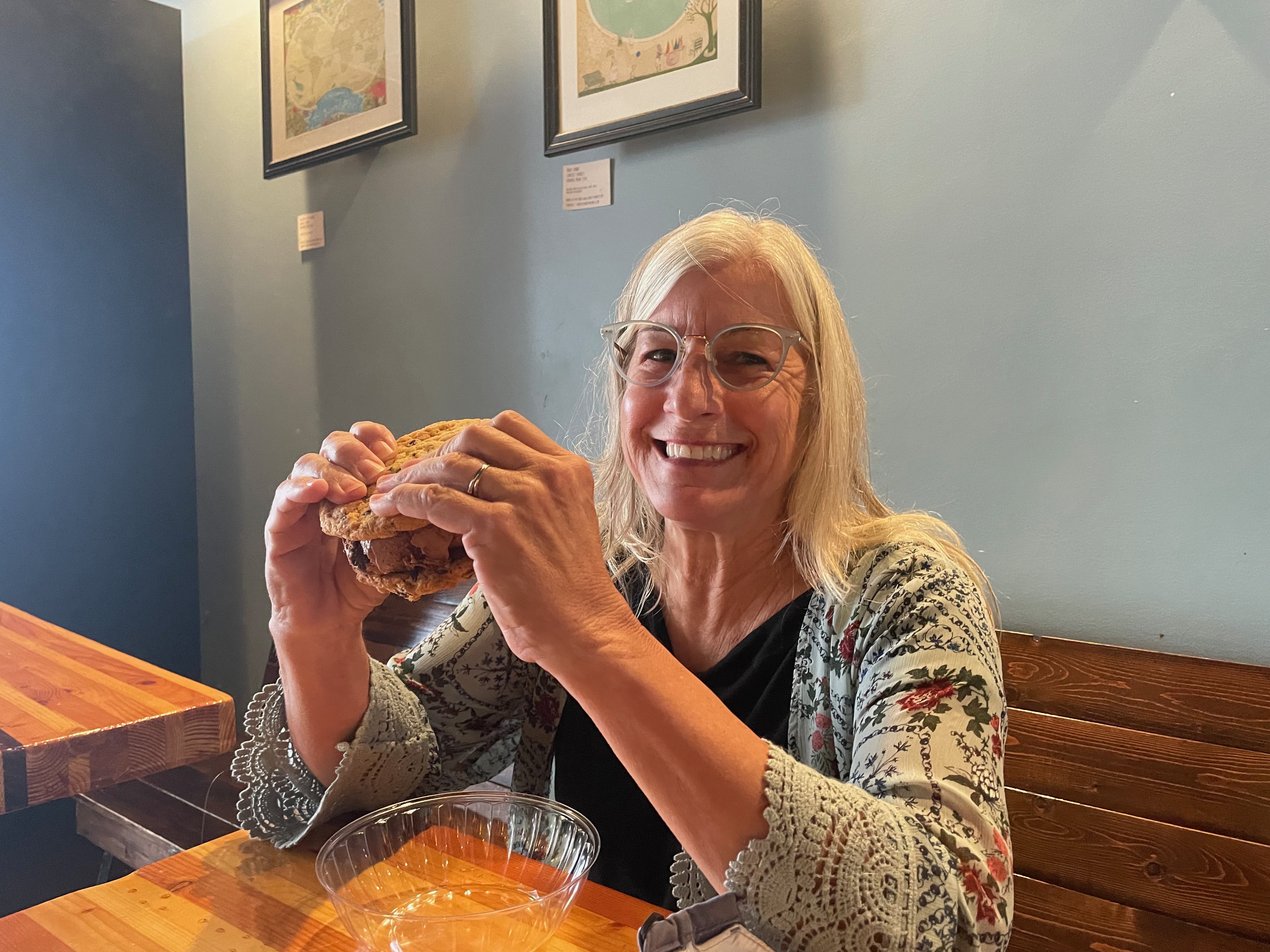 We returned to the house to find that Bev had arrived and after cleaning up we all took off for a local Target to get a new blow-up bed for the house, as the one we were sleeping on wouldn’t hold air. Too late in the afternoon for a big lunch, we did what any right-thinking person would do and stopped in at Betty Rae’s Ice Cream for two scoops apiece for Bev and I and an ice cream sandwich the size of a frisbee (OK, just a small frisbee) for Joanna.