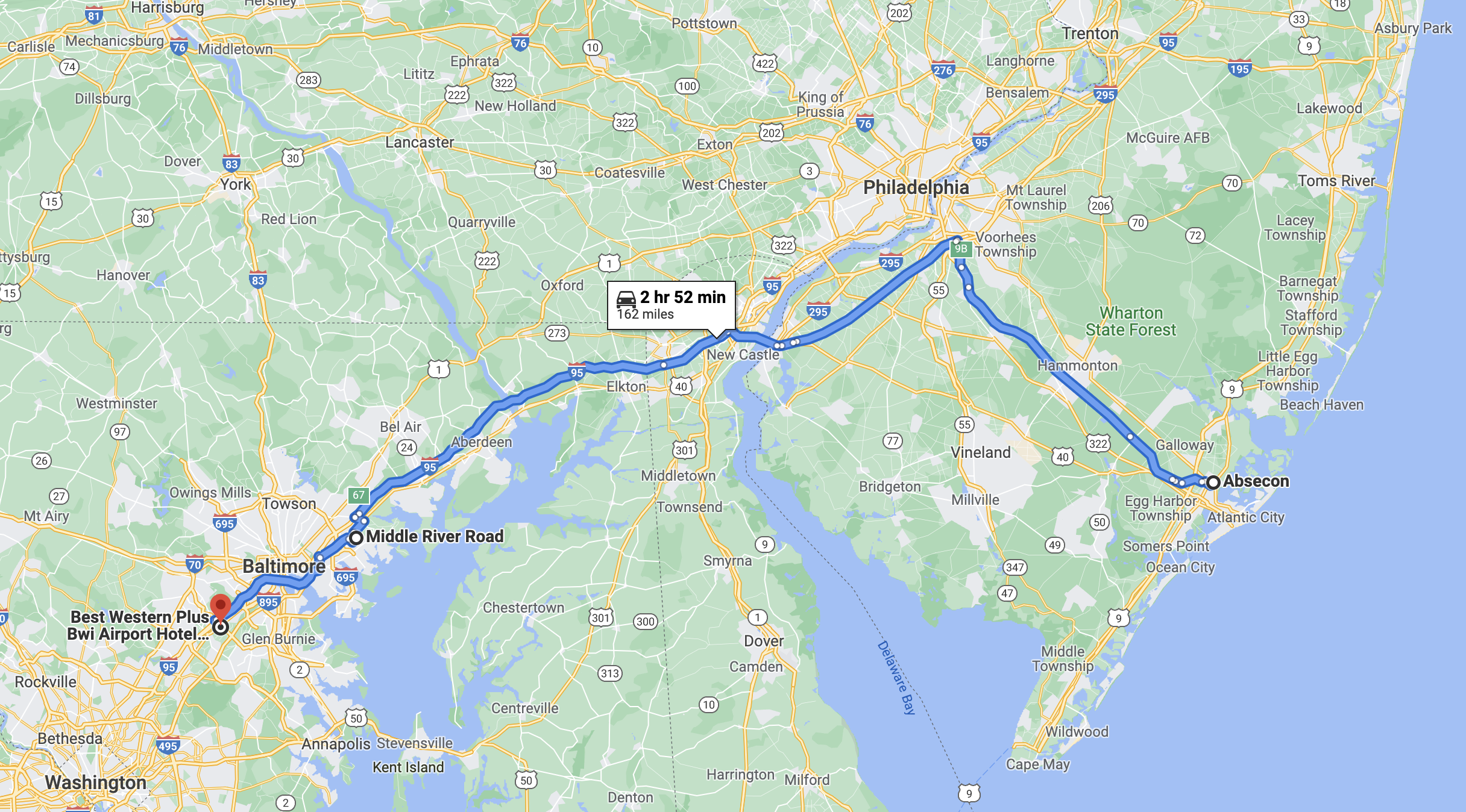We said our farewells to Jan at the restaurant and made our way back to the Holiday Inn, knowing we had a full day ahead of us. We’d drive a couple of hours down to the Middle River in Maryland to have lunch with longtime friends Gail and Don, and then to a suburb of Baltimore for the night and dinner with our nephew Jed. And we’d be one day closer to Durham and hopefully some answers about the Highlander and the path forward for the balance of the trip.