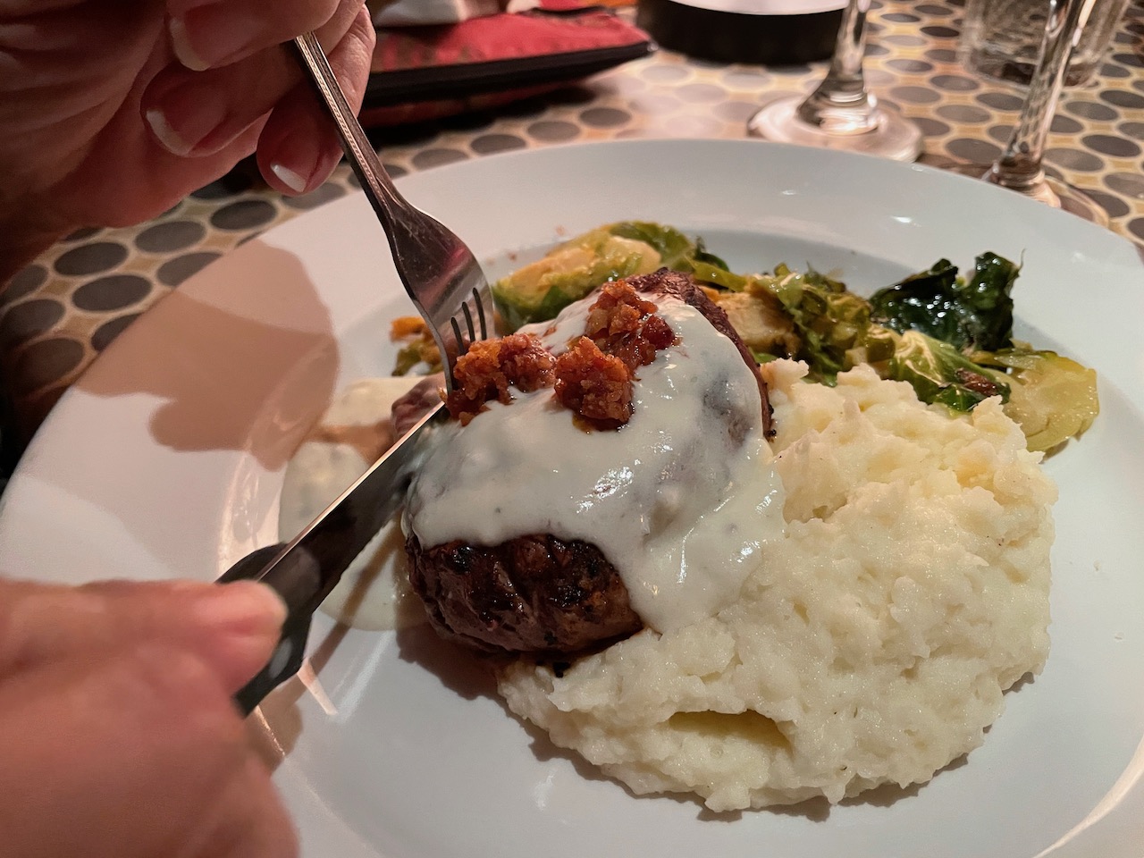 It was as good as it sounds and made us ready for our entrees, for Joanna the 6 oz Filet Mignon (Gorgonzola Cream and Bacon Jam) and for me the Pan Seared Springer Mountain Farms Airline Breast (Stuffed with Country Ham, Manchego & Tomato Jam, Shiitake-Rosemary Gravy), both served with mashed potatoes and that day’s vegetable.