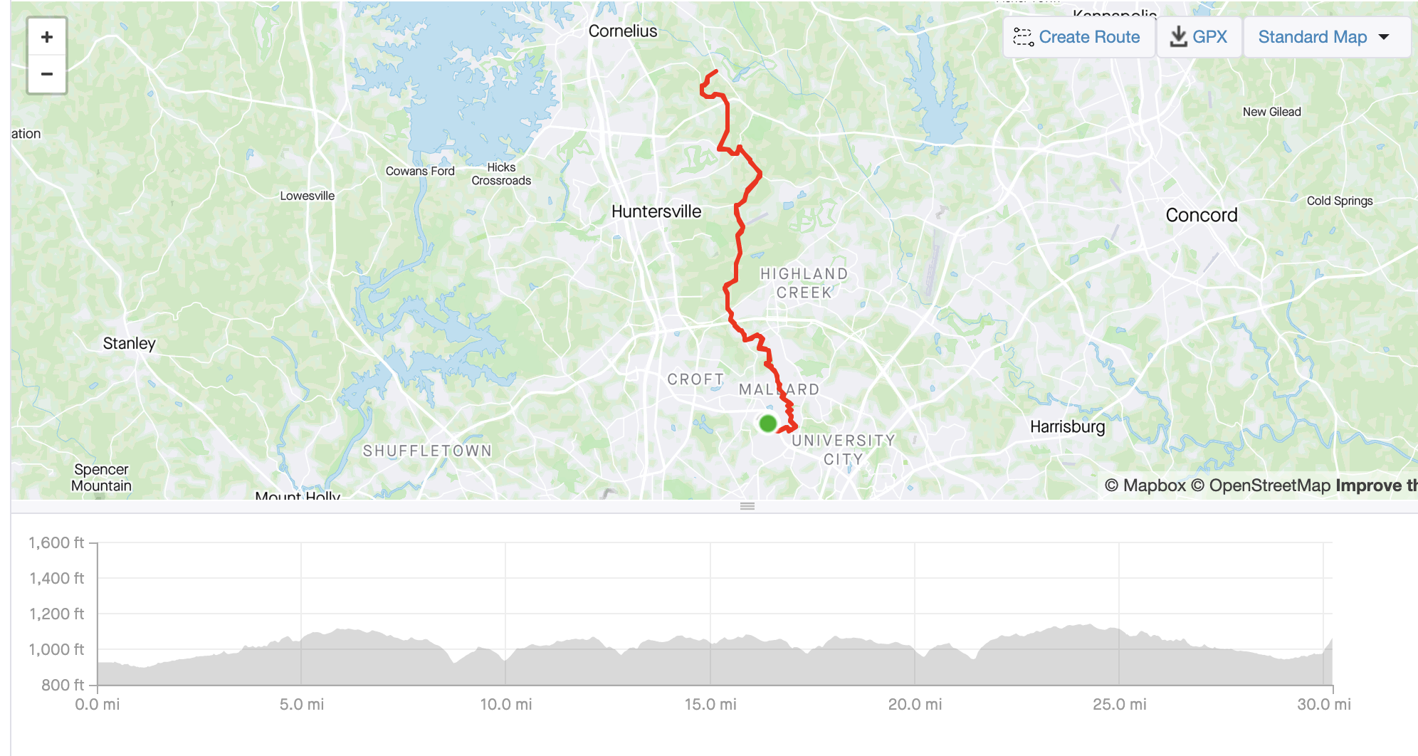 We started off at the shopping center parking lot on Highway 29 across from UNC Charlotte and then rode into campus, descending from the west side (where the engineering and motor sport buildings are) to hook up with the greenway that follows Toby Creek. We turned right and rode past the tennis courts and women’s softball field eventually leaving the school and crossing Highway 49 (the two roads form the western and eastern boundaries of campus) following it to its conclusion at Rocky River Road.