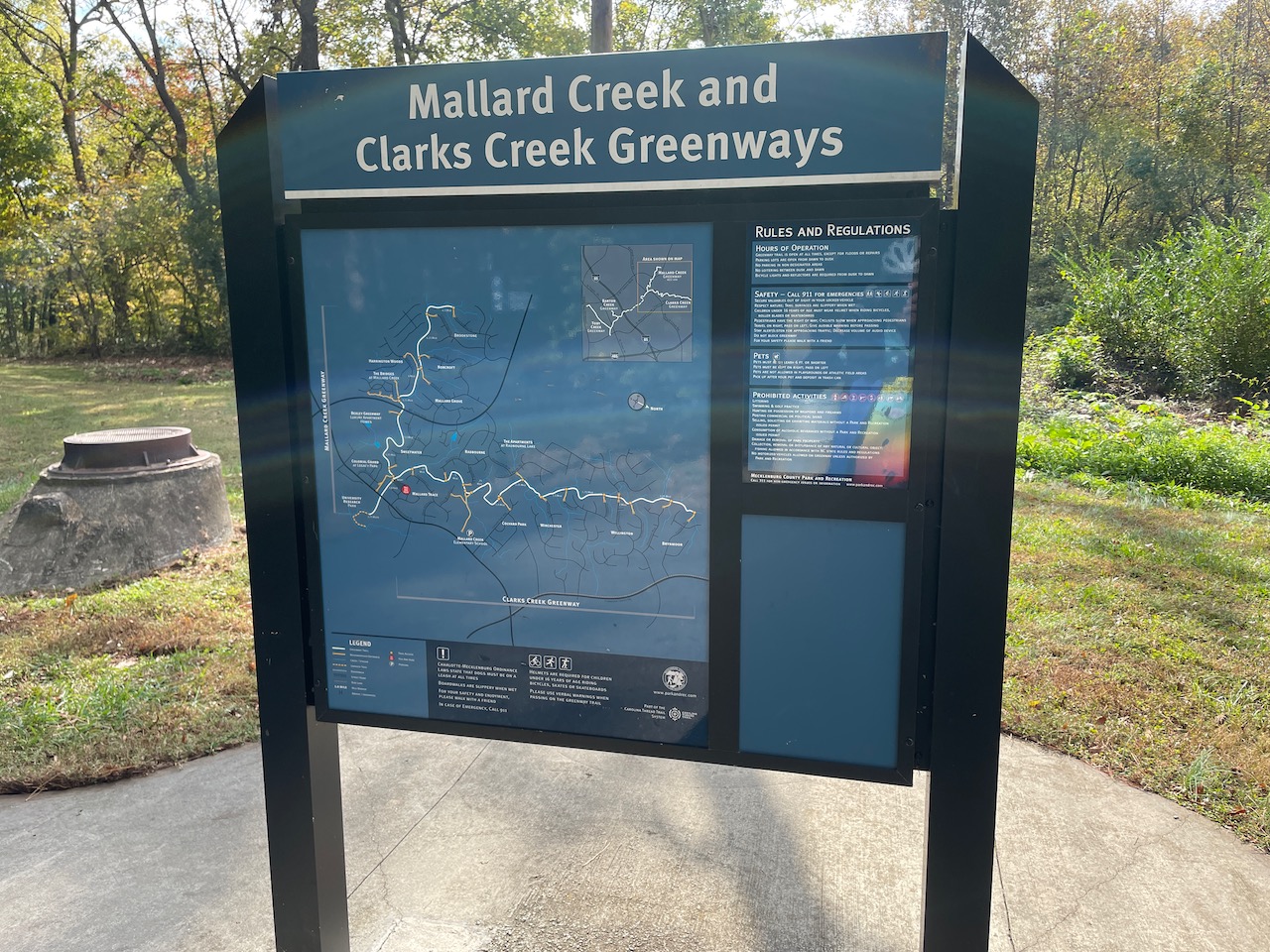 Eventually you hit pavement again and reach the intersection with Clarks Creek Greenway, which we transitioned onto, riding it to its end before turning around to return to the intersection where we turned right to continue onto Mallard Creek riding to where it ends, a few blocks away from Maylandia Rd., the street that we lived on. We climbed the steep hill to the top of the neighborhood, turned right to Maylandia and stopped to have a look when who should we run into, but our former neighbor George.