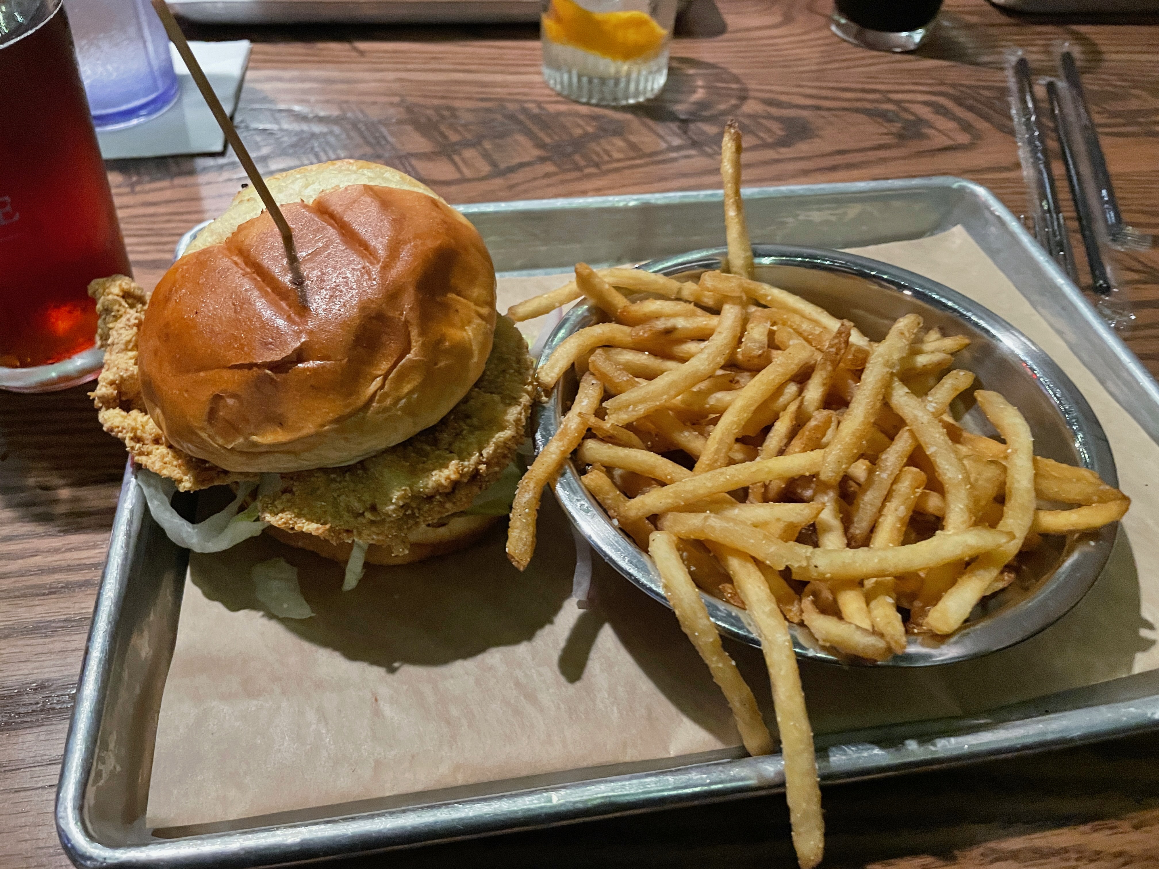 We arrived first and started off with drinks, a Catawba Evening Joe (Coffee Blond) for Joanna, and a Manhattan for me, both helping to clear the cobwebs after a long day in the car. Leigh and James soon arrived, got drinks as well and after some conversation we proceeded to order, the Chronic Pork Chop Sandwich (fried pork chop, tomato, shredded lettuce, red onion, pickle, sweet peppers, spicy mayo, yellow mustard on a potato bun) for me and a Power Salad (Lentils, Kale, quinoa, charred cauliflower, sweet potato, cucumber, avocado, craisins, crispy chickpeas, with sweet soy vinaigrette) for Joanna.