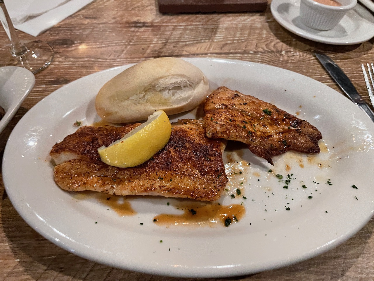 Emil was alone this time and after greeting each other we ordered drinks, for me the house chardonnay, and for he a Stella Artois. And from there the evening passed in the blink of an eye as we brought each other up to date on the five years that had elapsed. In between I ordered a grilled Red Drum (how I love this fish native to the Gulf) with a side brown rice and a Caesar Salad to start and another glass of wine.