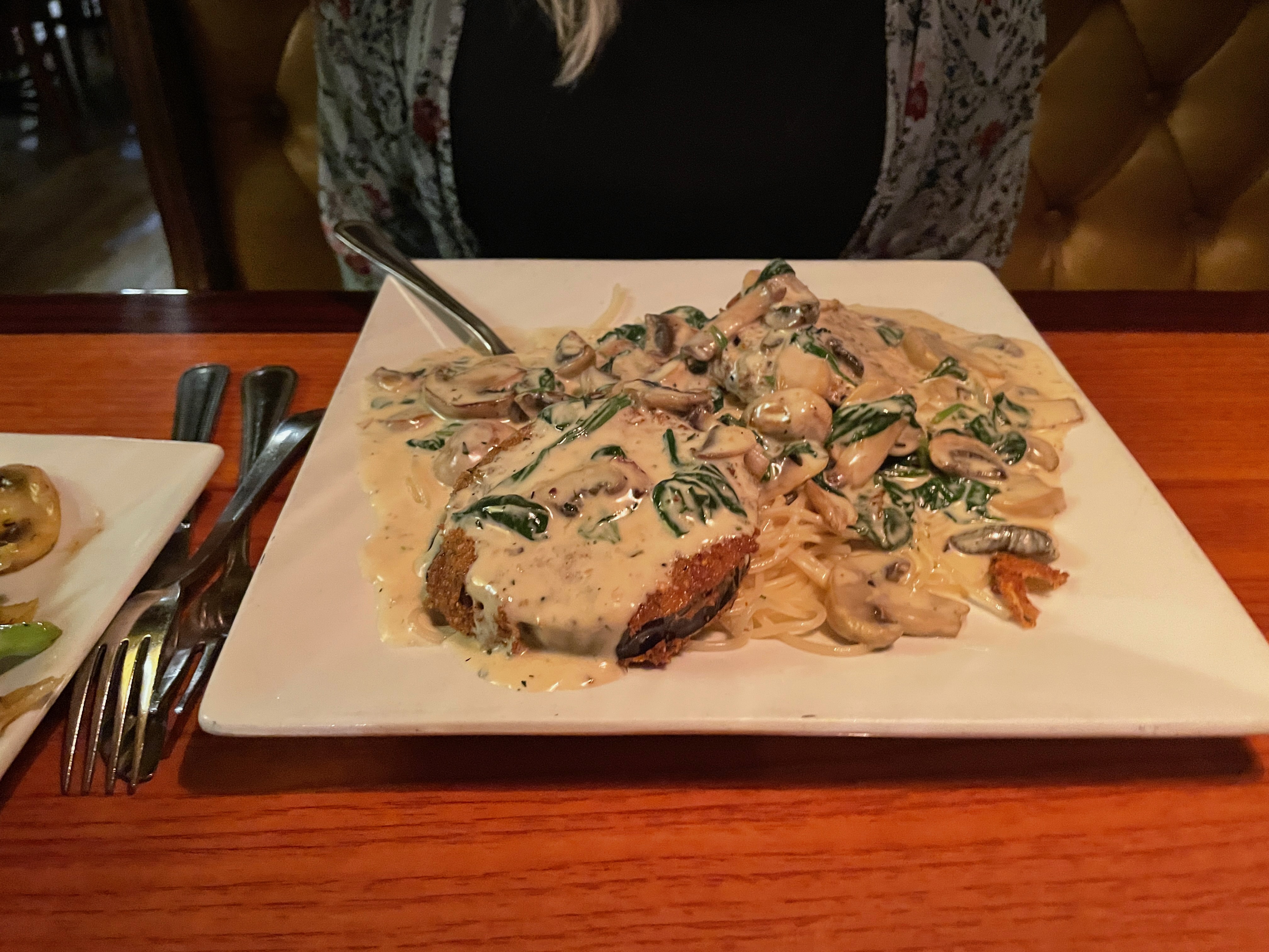 We would make the mistake, as we sometimes do, of ordering way too much food, particularly after putting a big dent in a basket of delicious house made rolls dipped in herb laced olive oil. For entrees, instead of splitting like we often do, we each went full in, Eggplant Florentine (topped with mushrooms, spinach, and an Alfredo sauce) for Joanna and Veal Marsala for me, at an incredibly affordable $13 and $17, respectively, which also included soup or salad. We also ordered a side of grilled vegetables. I mean, I’m still not sure what we were thinking.