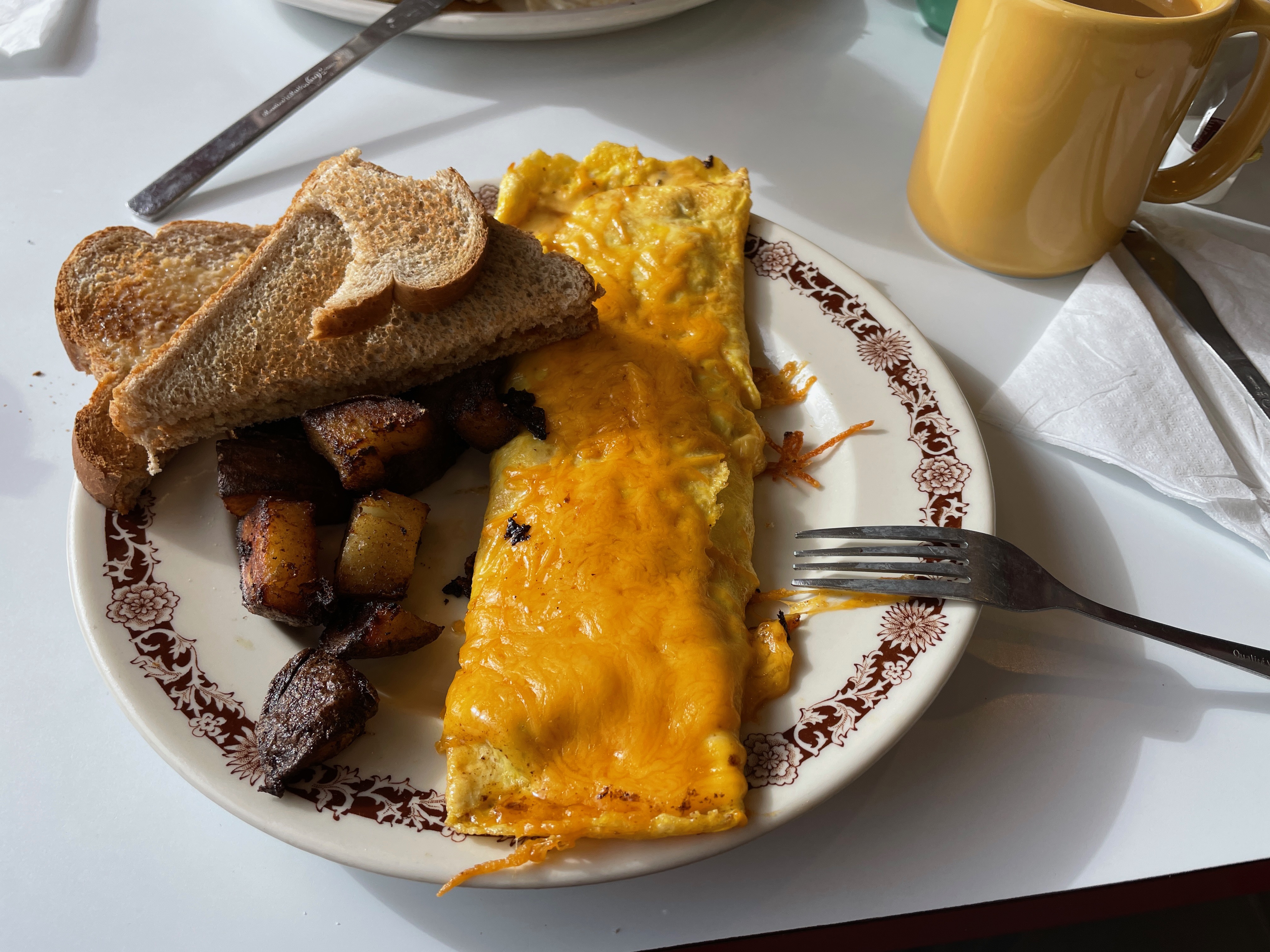 It’s a small place in a beat-up building and when you walk in there’s just four tables to sit at and one employee, the owner chef. We perused the menu, printed up with some typos and pasted over changes that revealed the lowest prices I’ve ever witnessed in my life. We’re talking about harkening forty years ago, with a giant ham slice at $2.25, an egg at $.85, and home fries for $1.50, my entire breakfast of two eggs, potatoes, and that slice of ham plus coffee cost just south of $7, proving once again that one might not want to live in rural Ohio, but one can certainly afford to do so.