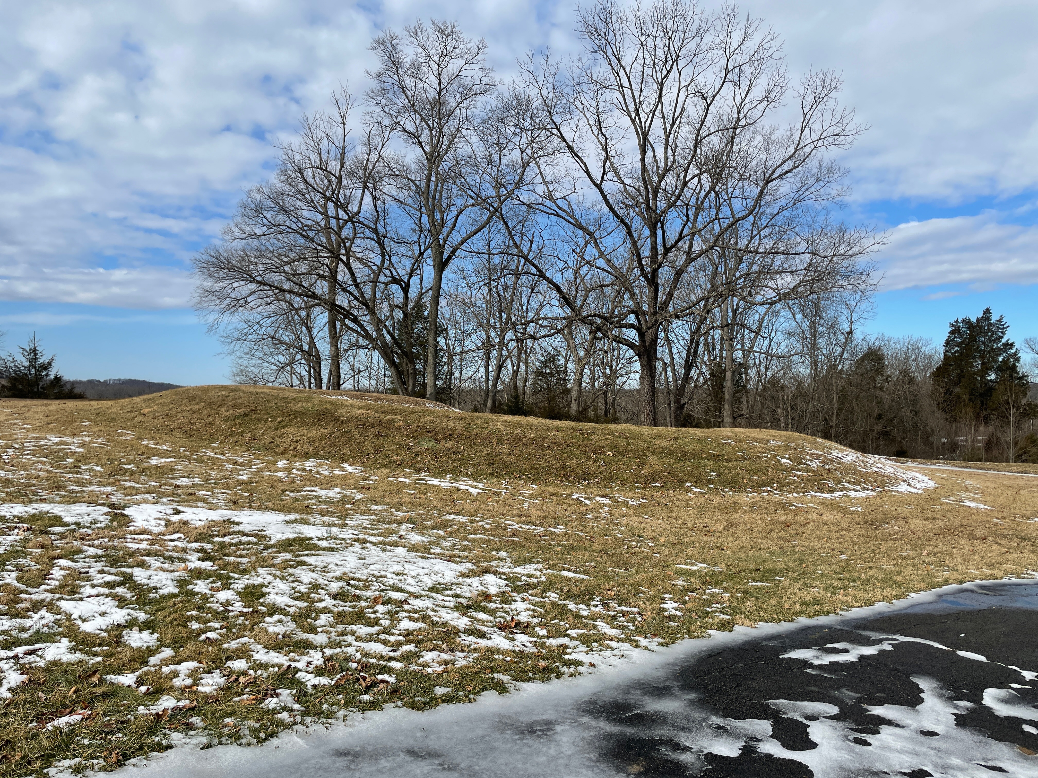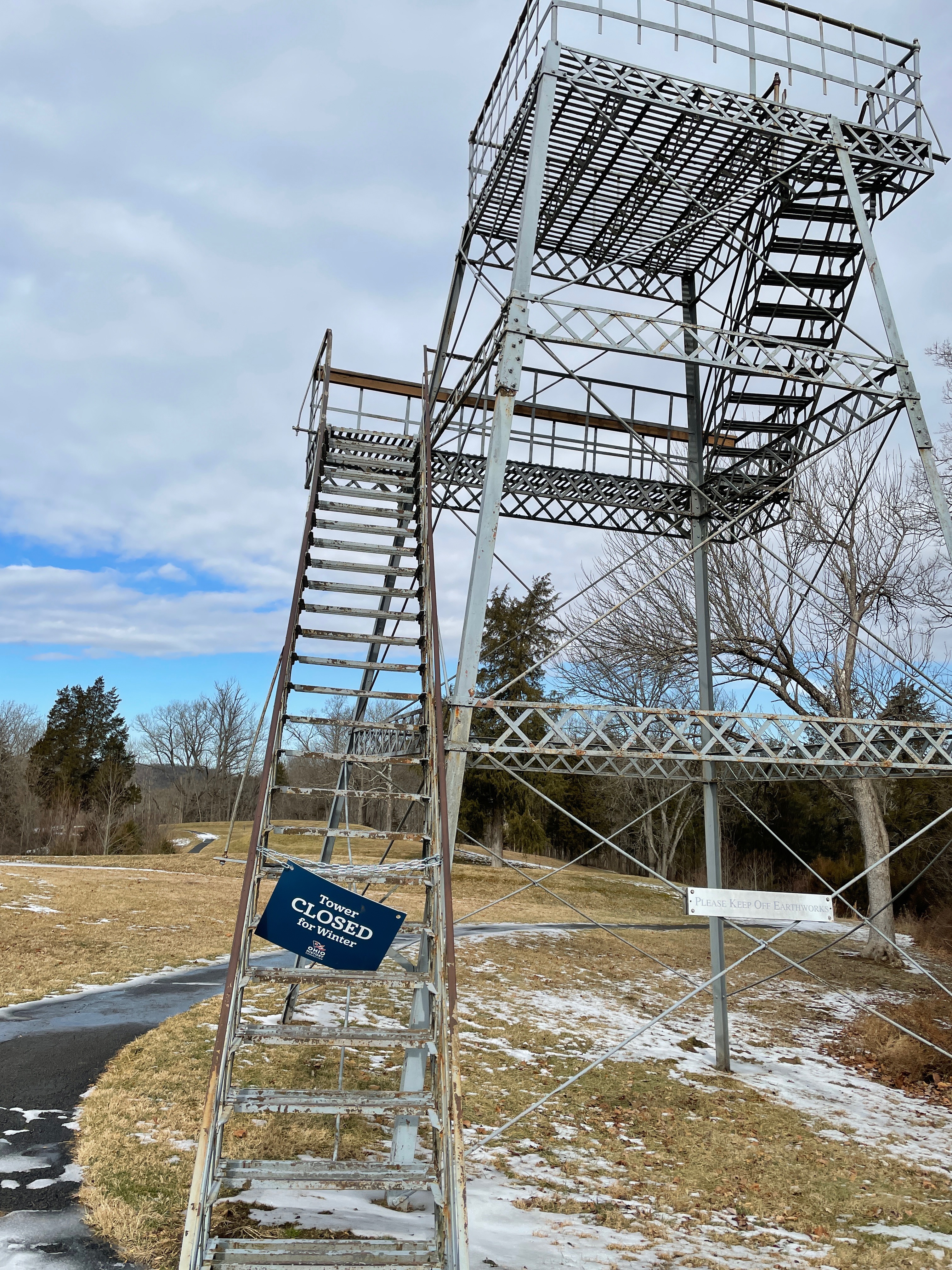 We pulled up to the park entrance and paid the entry fee of $10 and drove to a parking lot outside of the closed visitors center. From there we walked over snow covered grass to the viewing tower to catch sight of the mound from above, only to find the tower closed due to the weather. Returning to the car and driving out of the park, we paused at the entrance so Doug could give the attendant an earful about charging us money to enter a park where we couldn’t see the only attraction it offered. And so, it goes.