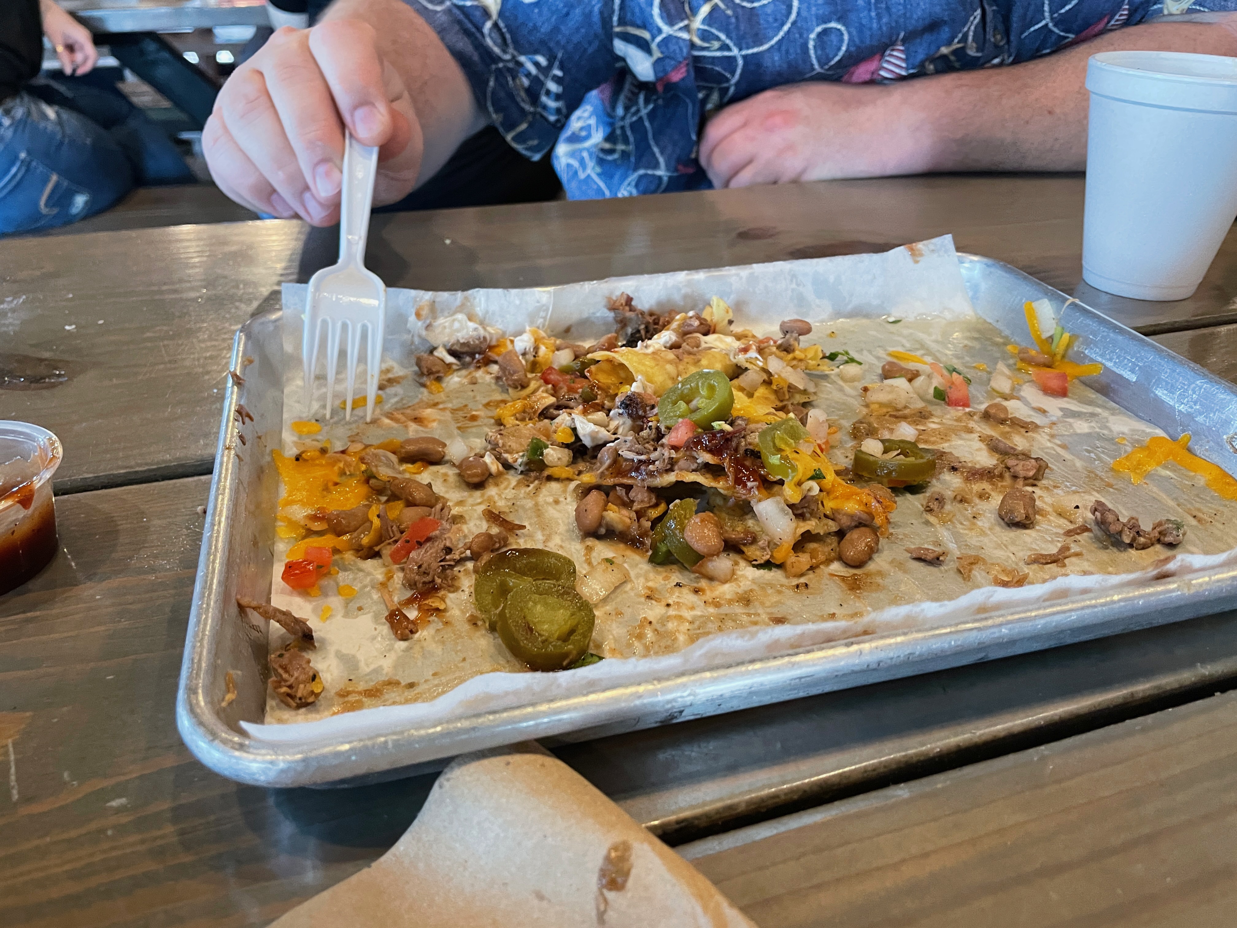After touring all of the exhibits and dealing with the crowded conditions, we were all ready for some liquid refreshment and so a stop at nearby Nueces Brewing was called for. Stephanie, Lee, and I killed the better part of an afternoon here last fall (https://3jmann.com/2022/02/27/east-coast-fall-2021-corpus-christi-texas/) , and it was nice to return to the place, particularly so I could get their Belgian influenced Trippy Tripel. As we were all a little hungry, we split an order of the Brisket Nachos which disappeared in record time.