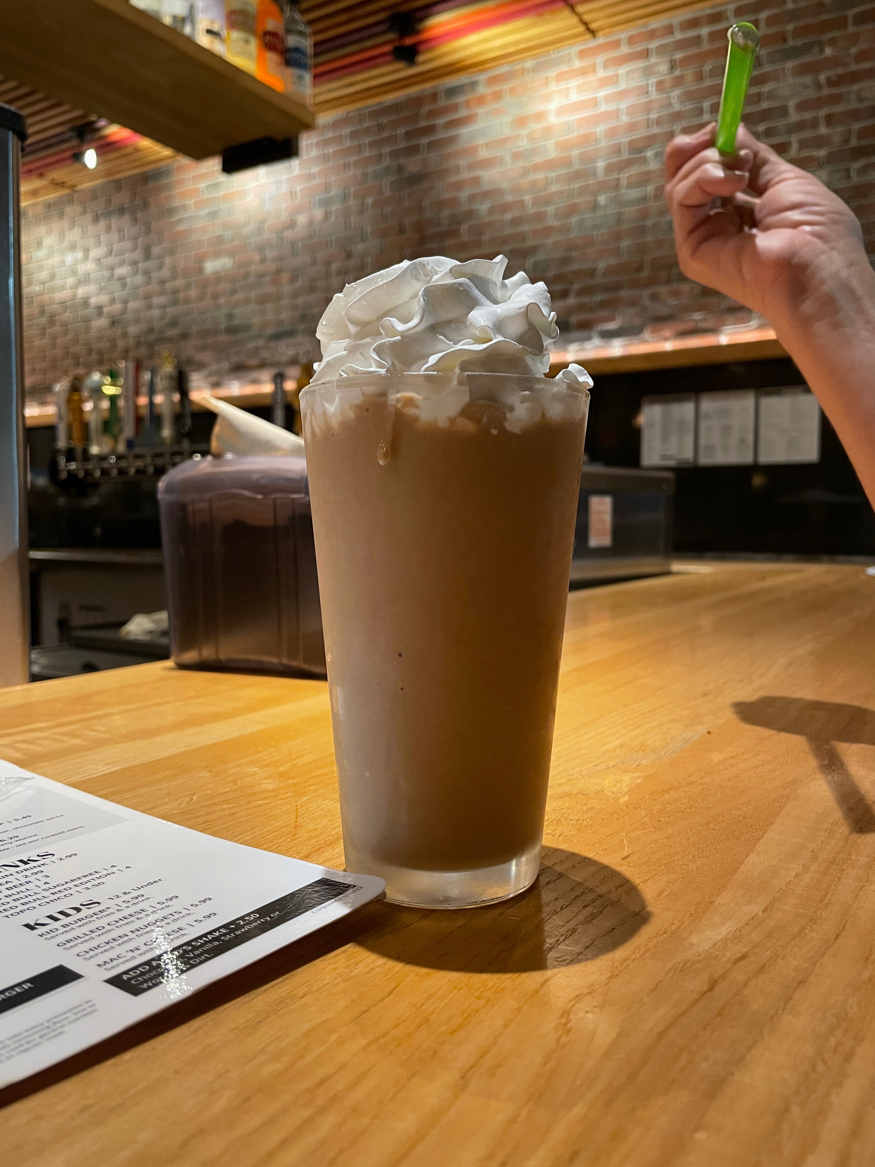 As the evening progressed, we realized that food was in order and so we made our way to Grub Kitchen + Bar, the hamburger joint I’d enjoyed during my last visit here (https://3jmann.com/2022/02/27/east-coast-fall-2021-corpus-christi-texas/). As with the last time, we sat at the bar enabling us to chat with the bartender as we perused the menu. One category there that I hadn’t noticed the last time but stood out for one of our party was that of Spiked Shakes, that is creamy concoctions loaded with booze.