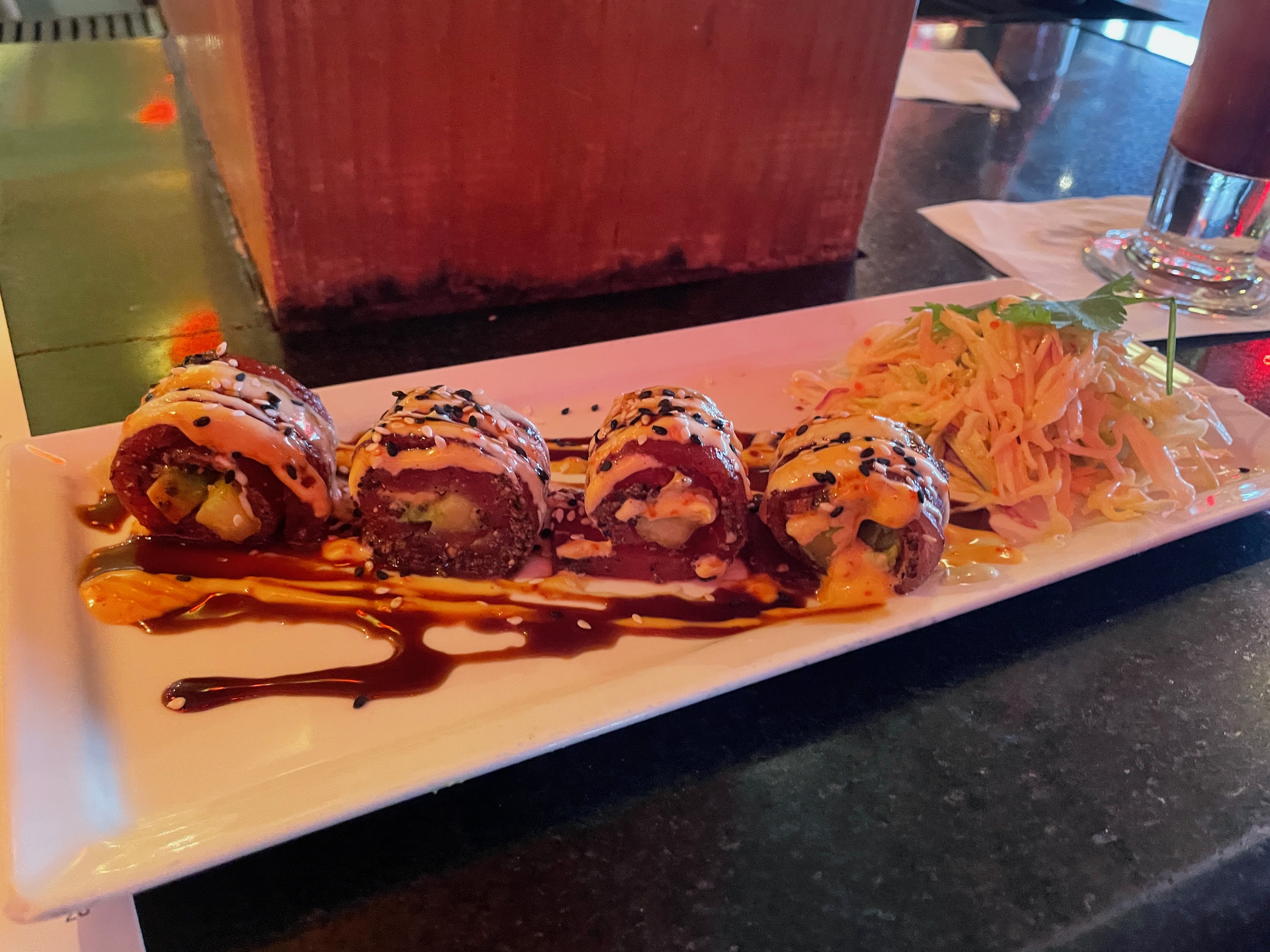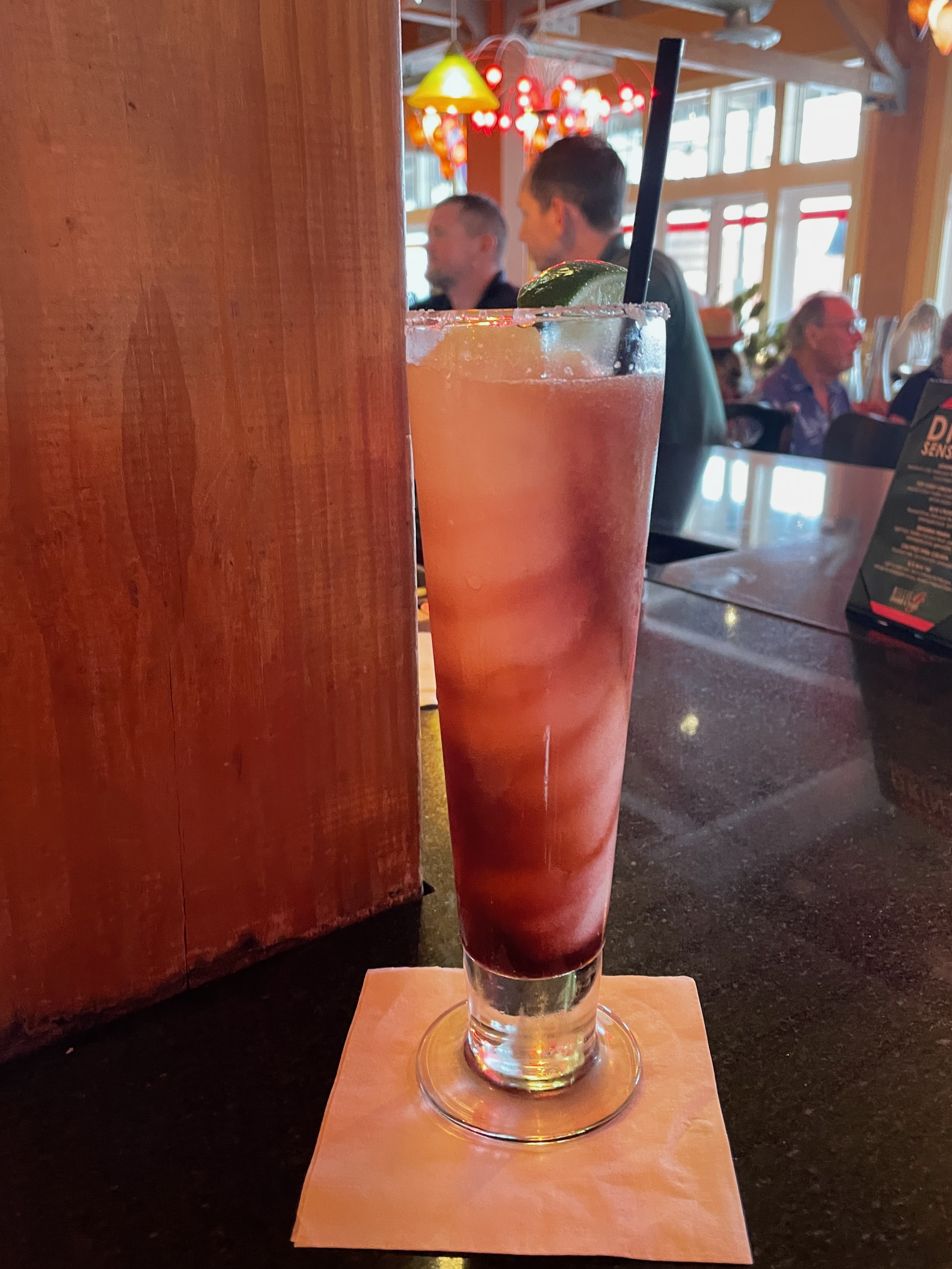 After checking out various happy hour options online, we landed at Willie G’s Seafood and Steaks on Harborside Drive as its prices looked reasonable and the food offerings seemed to be a cut above your typical fare for this time of day. We were not disappointed. Seated at the bar, Joanna chose a Strand Swirl cocktail while I’d down two $5 glasses of BV Coastal Sauvignon Blanc. We started with the Seared Tuna (with sliced avocado and wasabi cream) and were delighted with the choice.