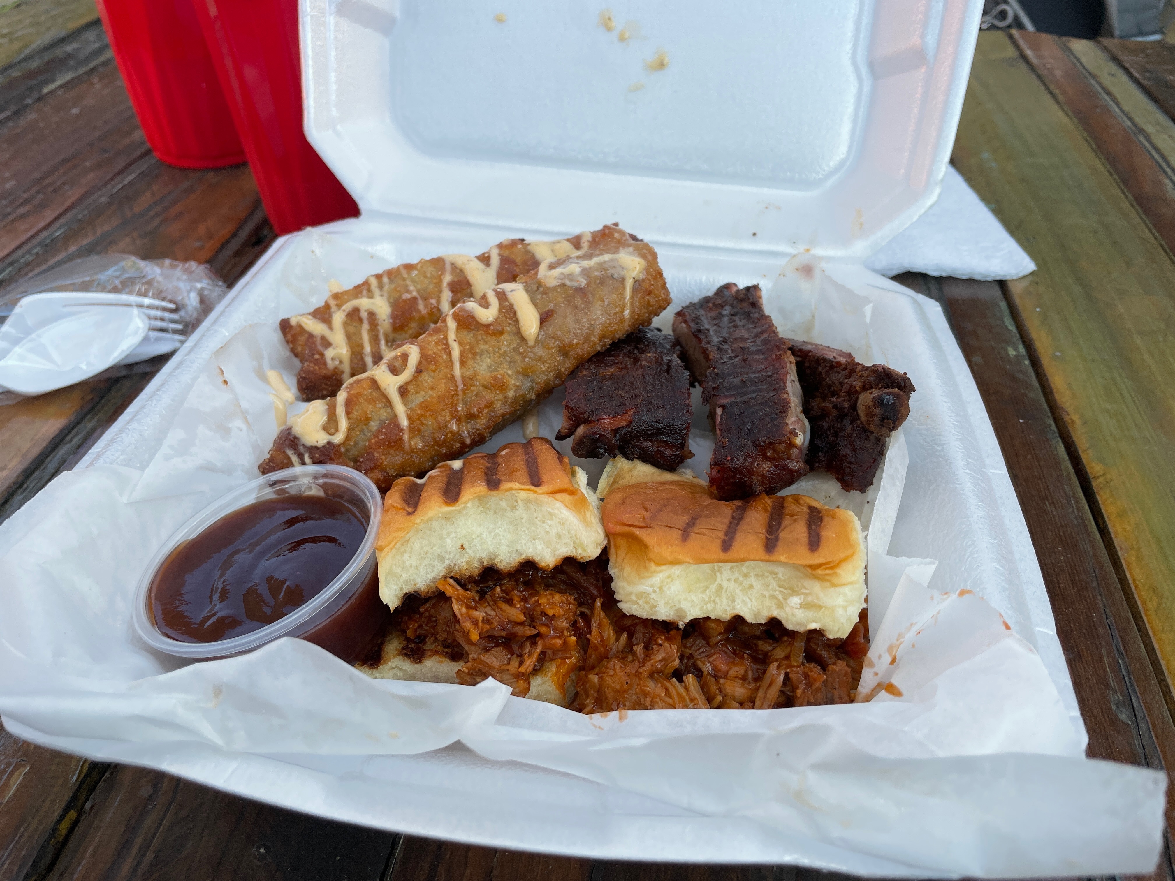 It was a pleasant evening to be outside (the bartender, when asked about the lack of customers simply said business ebbs and flows) so we enjoyed our beer until it was time to walk up to the trailer that served as a kitchen to fetch our food. And I’d like to say that regardless of the sketchy neighborhood, the lack of crowds, and the rustic nature of the place, this was a dynamite plate of food. The ribs were meaty and tender, the egg rolls a unique taste sensation, and the pork sliders simply delicious.
