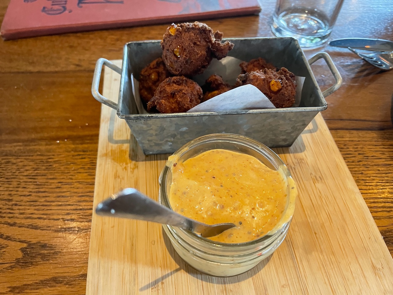We first ordered the Crawfish Corn Beignets with mustard rémoulade, a dish so unique and tasty we’d likely order it every time we’d visit. What’s not to like about deep fried corn fritters with just the hint of mild crawfish? Exactly!