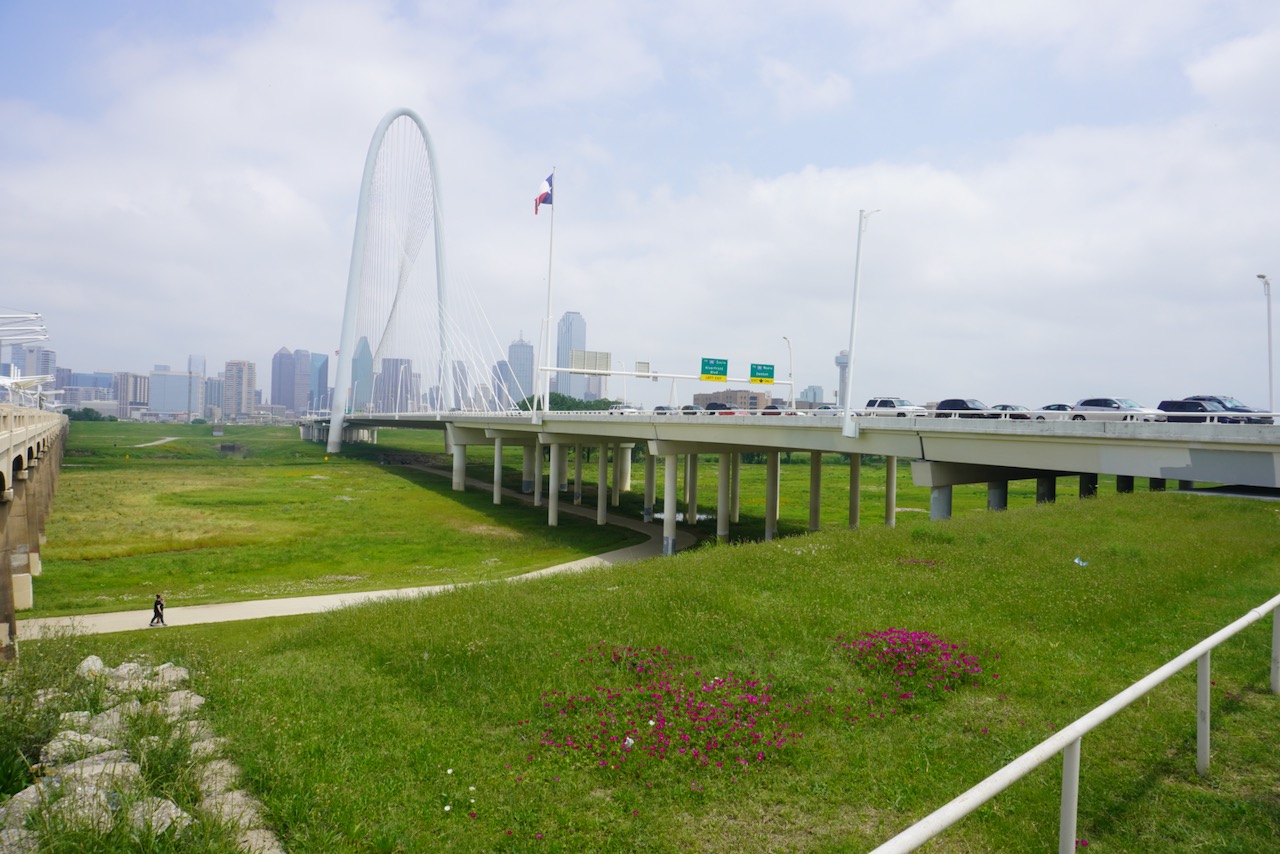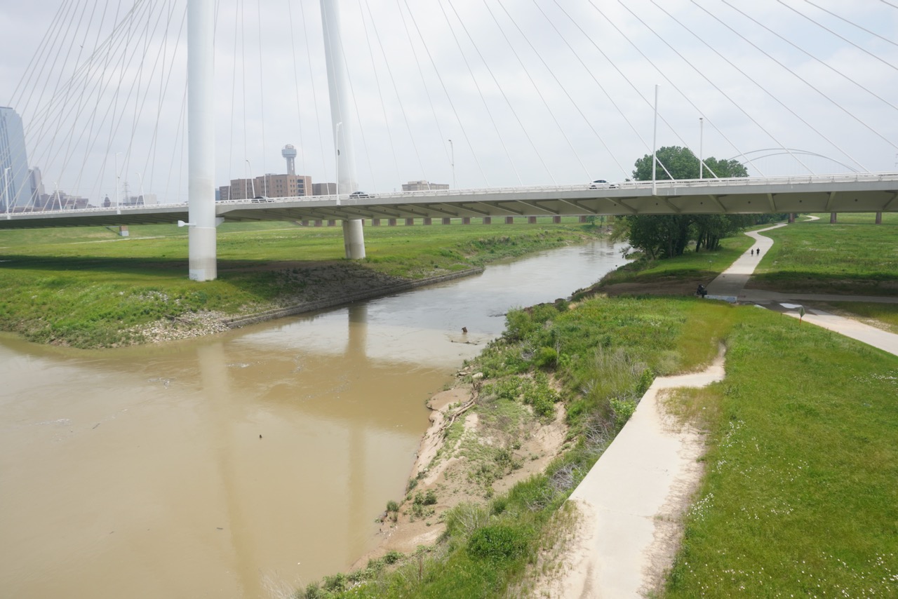 We left downtown with no other touristy motive than to drive around a bit and as we ascended the onramp to the freeway noticed a bridge in the near distance that caught our attention. We steered the car in that direction and after some circling, found a parking lot that enabled us to access the Ronald Kirk Pedestrian Bridge, lying parallel to the Margaret Hunt Hill Bridge and the 1930 Texas and Pacific Railway Trinity River Bridge as they all cross the river of that name.