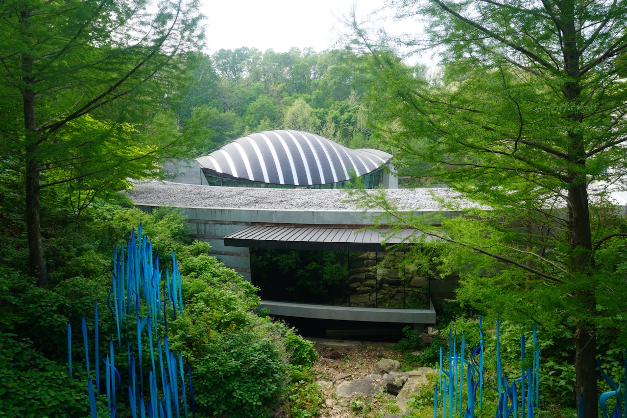 Spearheaded by the Walton Family Foundation’s involvement the museum’s glass-and-wood design by architect Moshe Safdie and engineer Buro Happold features a series of pavilions nestled around two creek-fed ponds and forest trails. The 217,000 square feet complex includes galleries, several meeting and classroom spaces, a library, a sculpture garden, a museum store designed by architect Marlon Blackwell, a restaurant and coffee bar, named Eleven after the day the museum opened (11/11/2011).