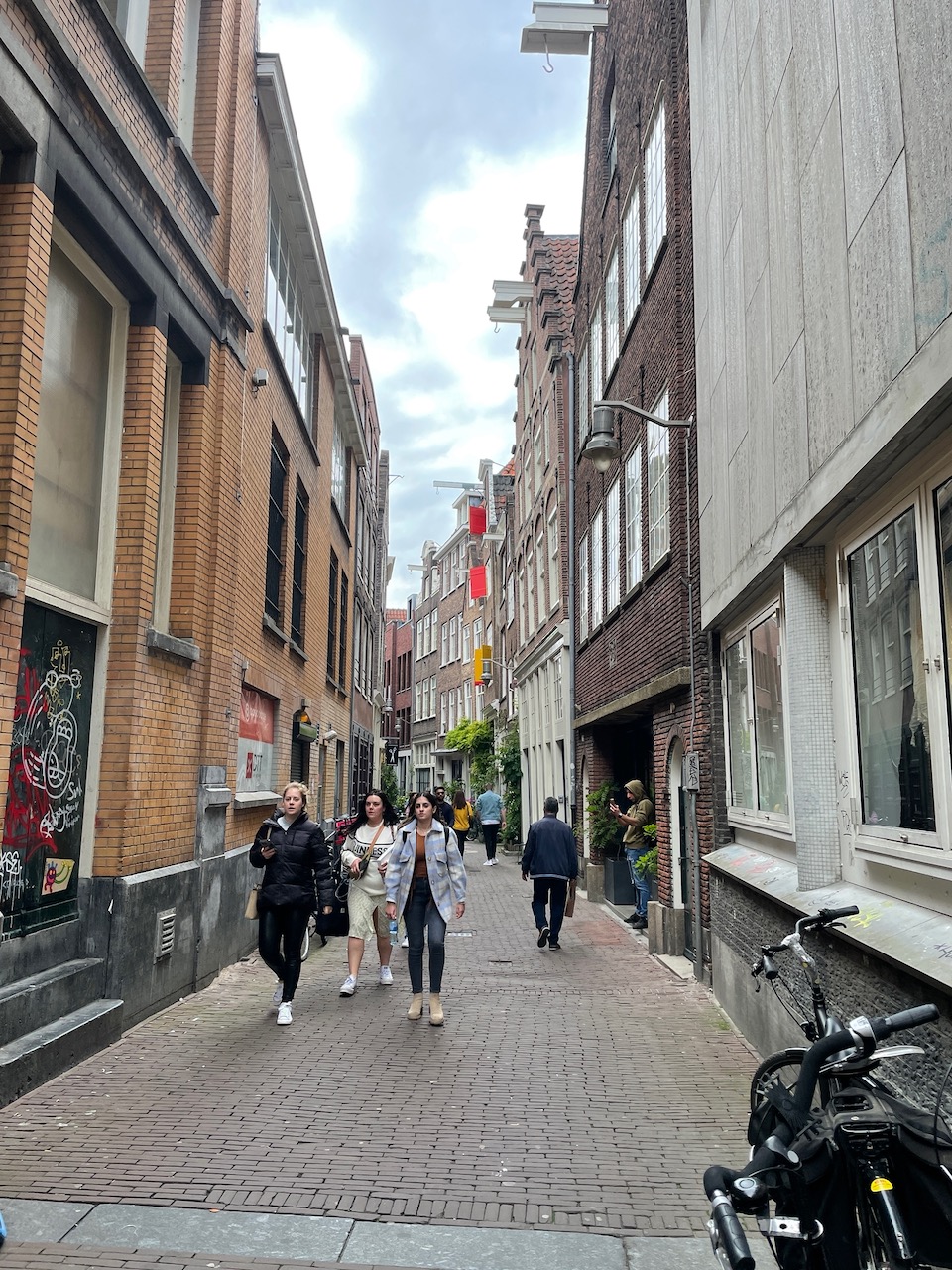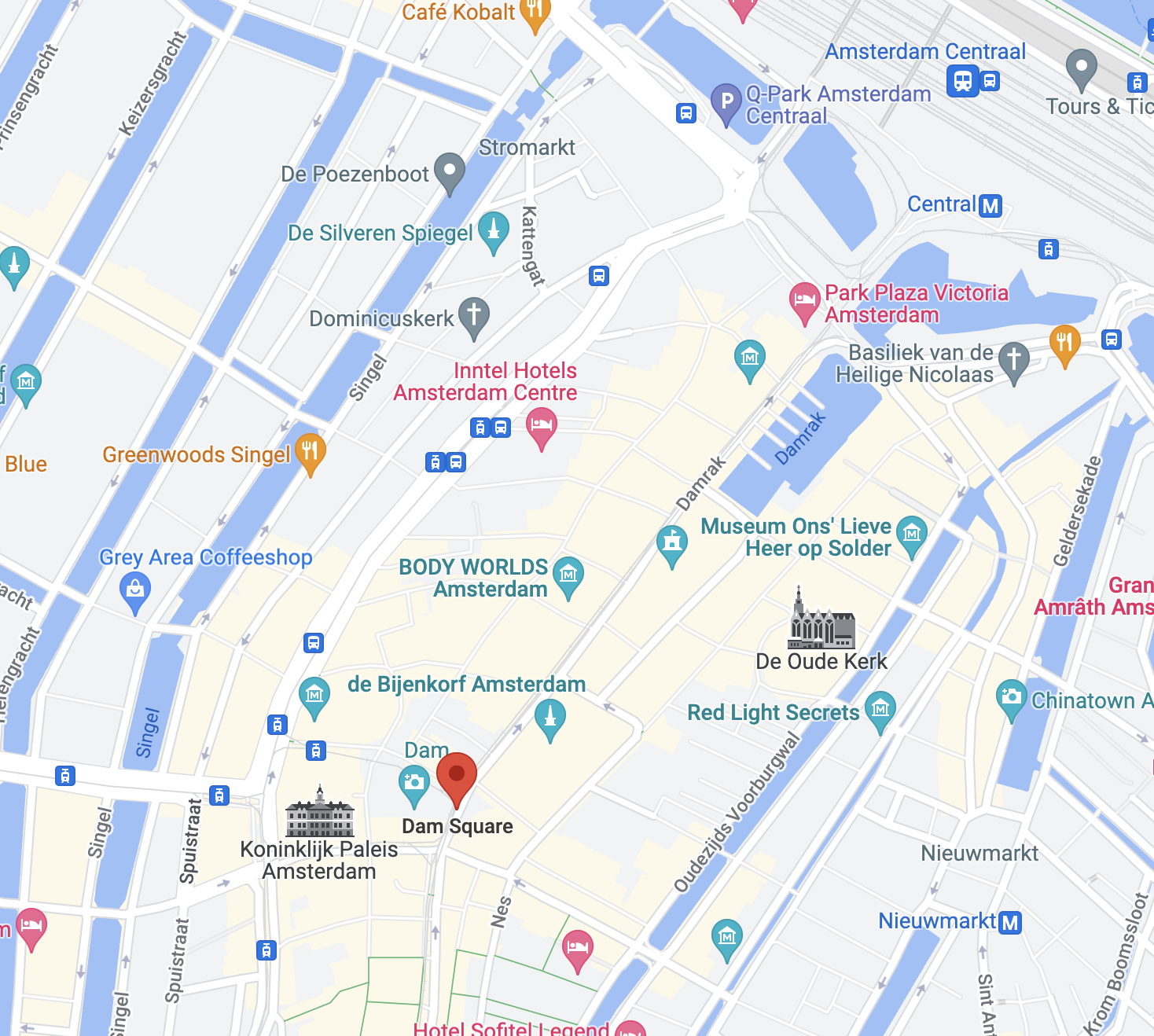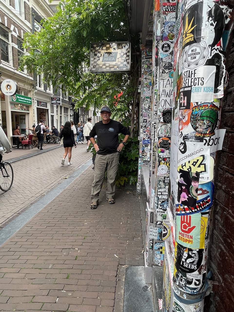 We drained the last of our beers and repeated our route on the tram until we reached Dam Square, where we departed and began to wander the side streets adjacent to Amsterdam’s main street, the Damrak. This is a place rich in memories; In 1977, Rendy, Evan, and I, having discovered in Brussels that three men with large packs would not find great success hitchhiking, took the train to Amsterdam and on advice we’d received through savvy travelers, found the main American Express Office on the Damrak.
