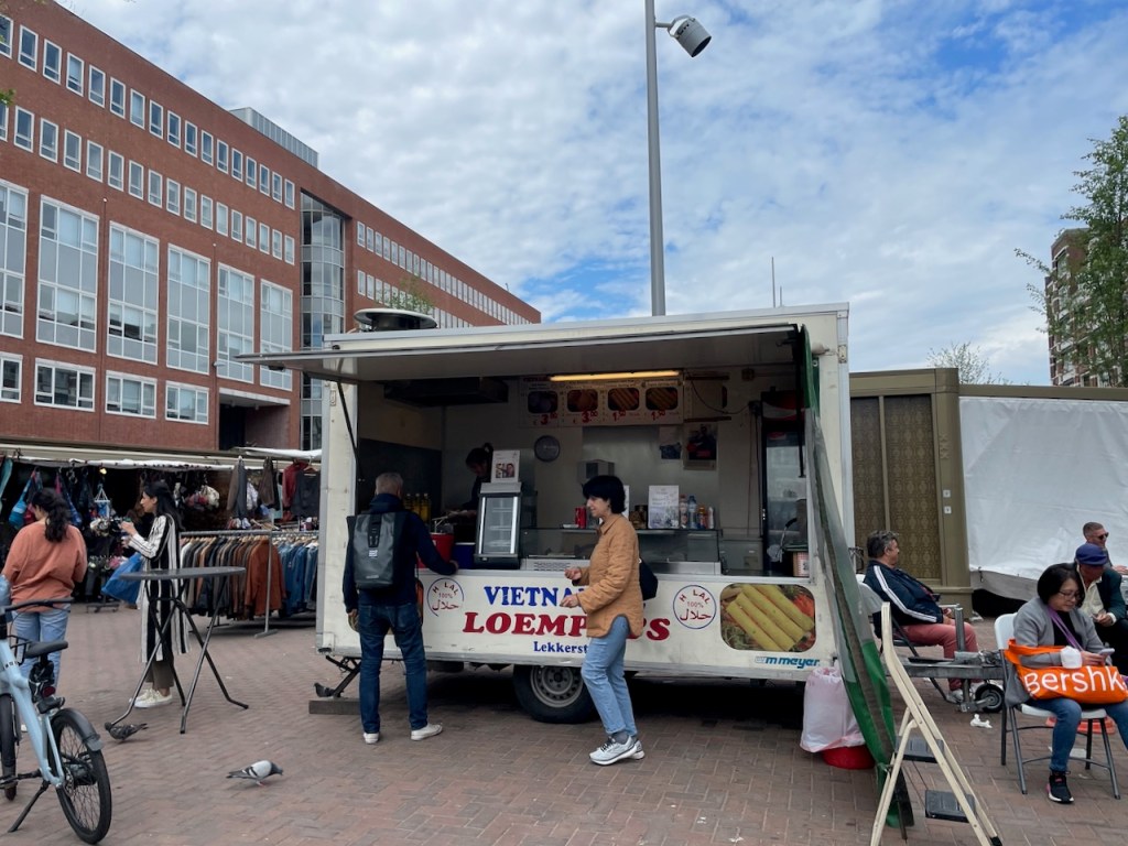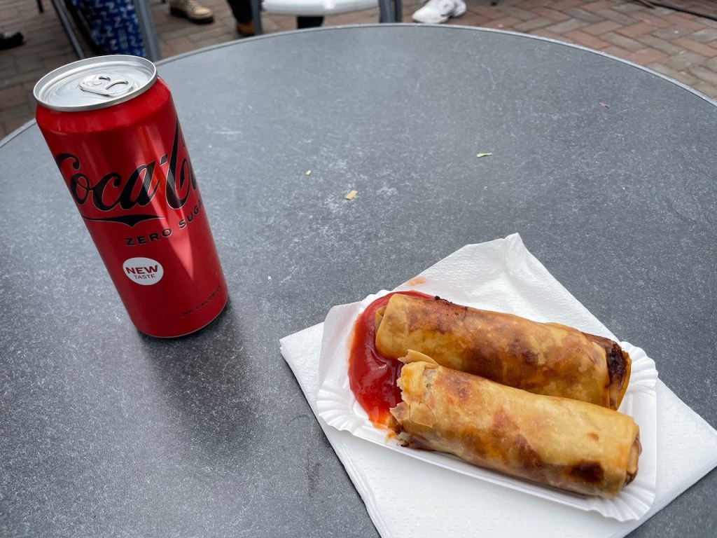 It was indeed a big, colorful marketplace with something like 300 booths featuring a cornucopia of merchandise, including but not limited to, new and second-hand clothes, old military uniforms, old books, videos and DVD’s, electronics, and all types of other curiosities. We perused the stalls for quite some time, eventually picking up a t-shirt for Gemma and then feeling peckish, stopped at a Vietnamese food trailer for an order of two Loempia, tasty springs rolls (one each of pork and shrimp) and a Coke Zero.