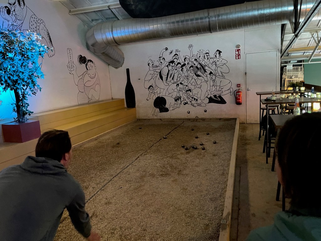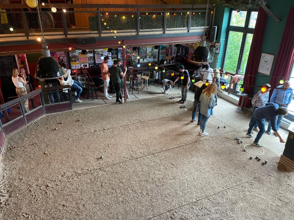 It’s a family friendly (at least on the weekends) place with beer, wine, spirits, a food hall featuring three vendors and the main attraction, Boules or Bocce Ball. We ordered a couple of beers at the bar and as no seats were available downstairs, climbed up to one of the two upstairs Boule pitches and spent the next hour or so enjoying our drinks as we watched two families engage in spirited games.