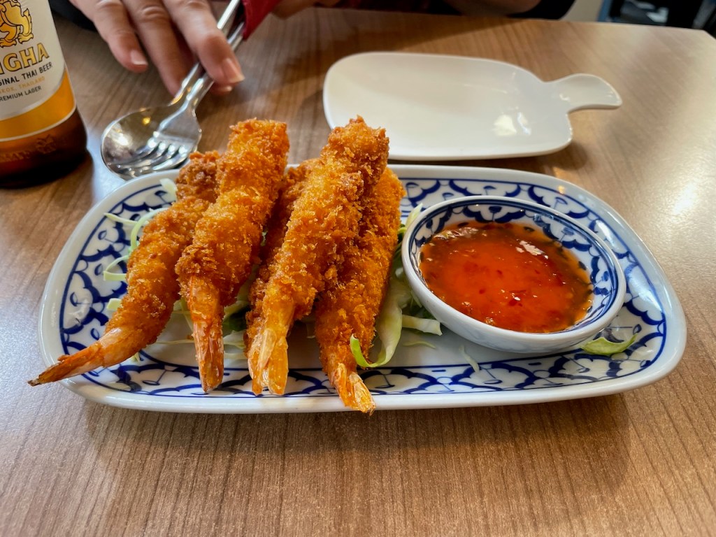 As luck would have it, this was a good choice as the food was excellent, the service prompt and friendly. Along with a couple of Thai beers to drink, we started with the Koeng hom place (deep fried shrimp with sauce), four large shrimp with a tangy sweet sauce for dipping.