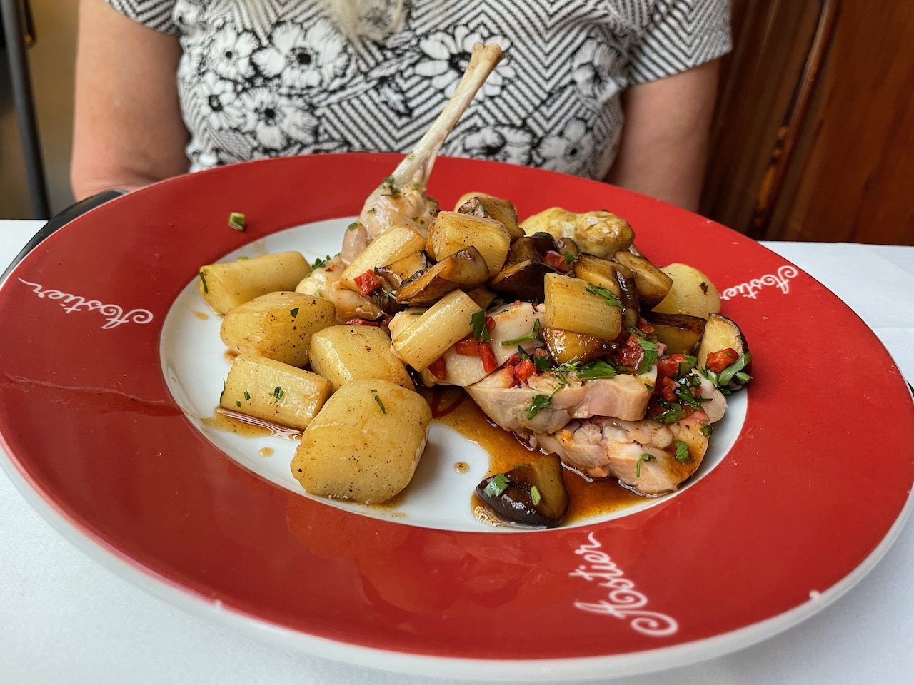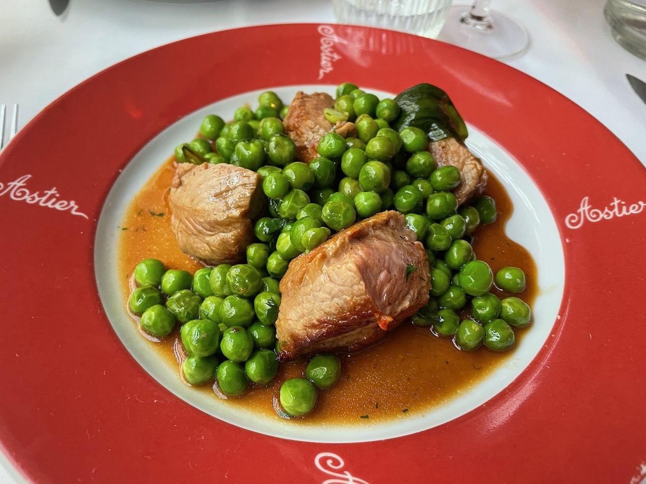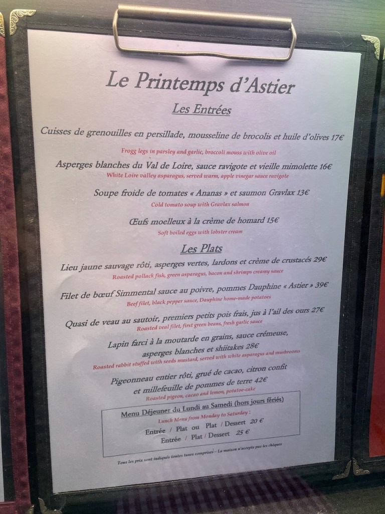 Anticipating our three nights here, we had made a reservation for this first one at Astier, the restaurant we’d had a nice meal at in 2014 and conveniently located a block or so down the street. We arrived just before they opened and sat outside waiting, enjoying the warm spring air. Once seated inside at a nice table by a window, we ordered a glass apiece of a house wine (7-euros) and perused the menu, eventually deciding on the Lapin farci a la moutarde grains (roasted rabbit stuffed with mustard seeds with white asparagus and mushrooms) for Joanna and the Quasi de Veau au Sautoir (roasted veal filet with peas in a garlic sauce) for me.