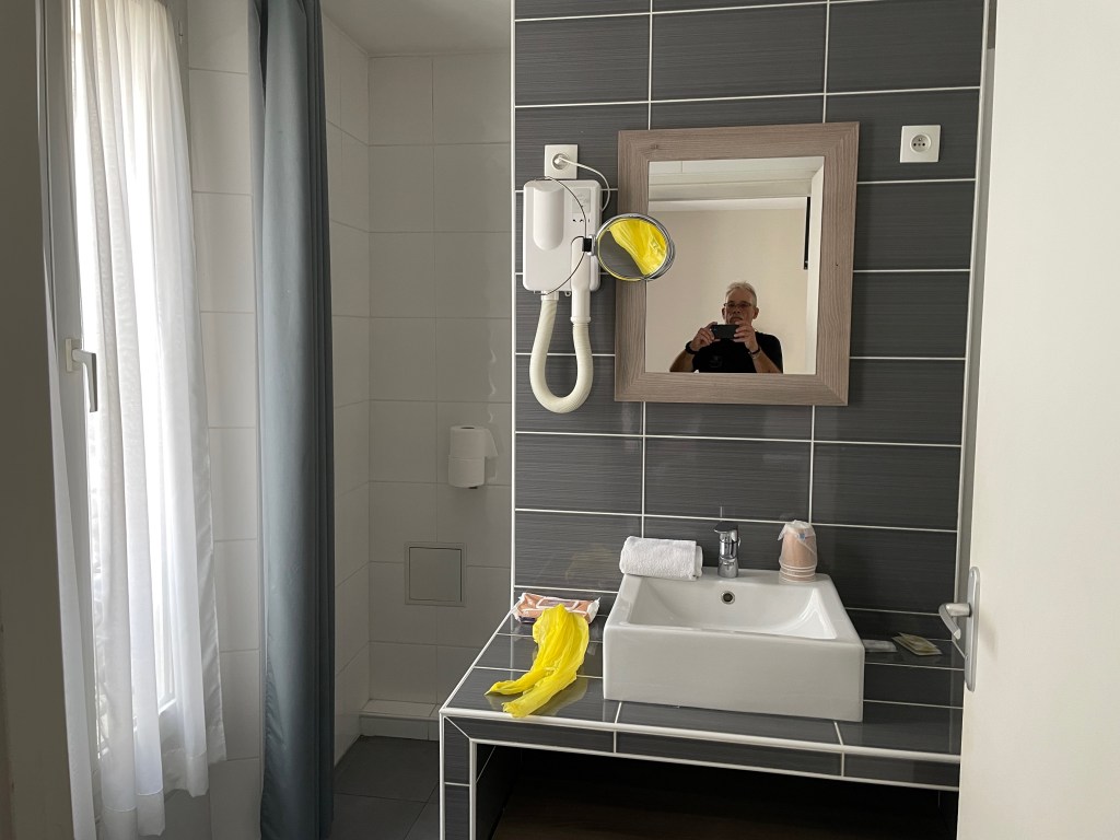 Of course, we got lost on the first leg of the Metro and it took us longer than it should have to get to our stop, but we eventually we arrived and exiting, knew which way to turn on the right street to make the left onto Rue Jean-Pierre Timbaud and soon we were checked in. Amazingly, we found ourselves either in the exact room we shared with Bev in 2014, or one just like it, with one double and one single bed. In the intervening years, the hotel freshened the bathroom and installed a heat and air conditioning unit, which we would make use of as it would be warmer and therefore less comfortable than normal throughout our stay in town and in Europe in general.
