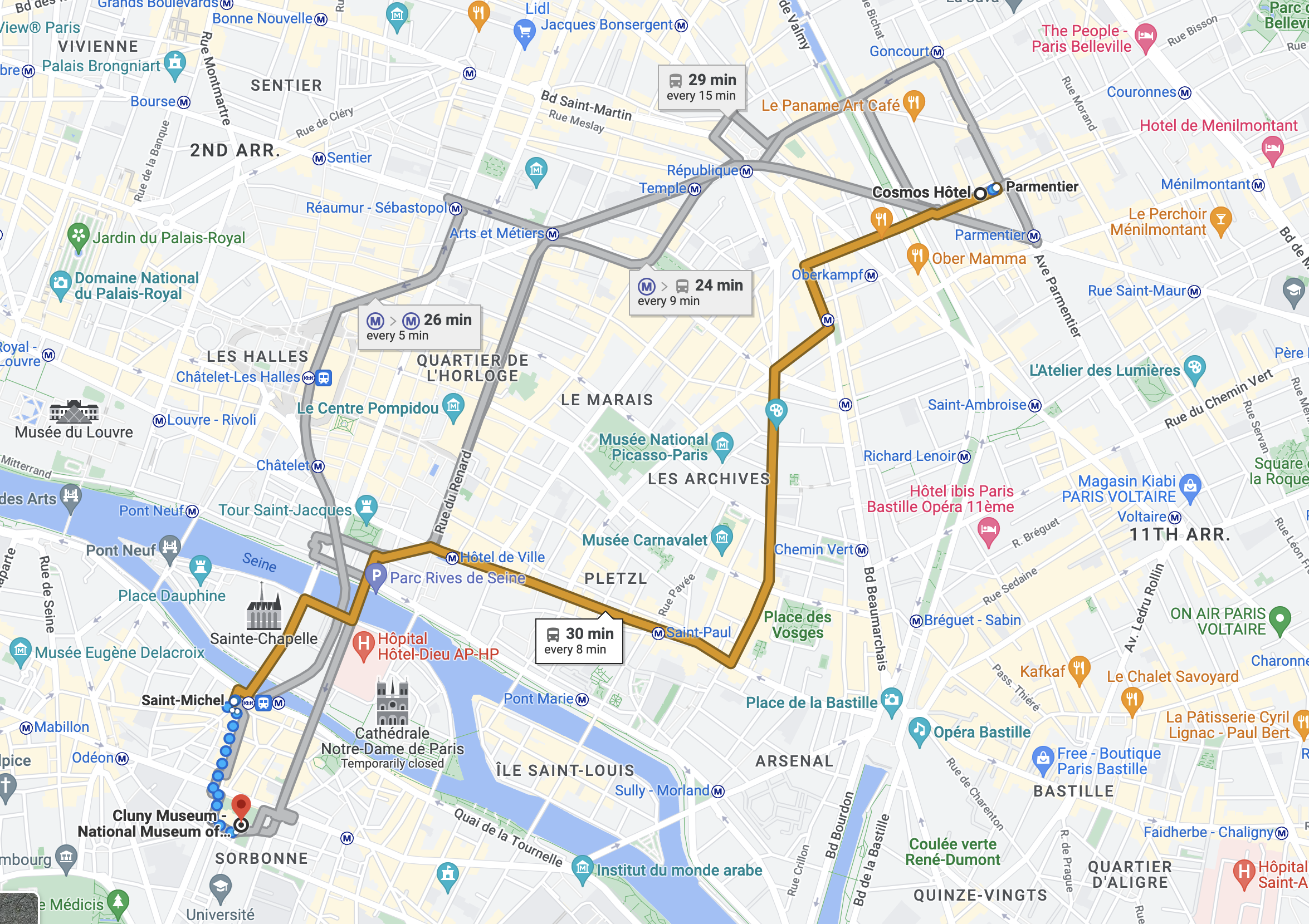 Thus fortified, we hopped on the Line 96 bus using the three-day Paris Visite passes we’d purchased at Gare du Nord, two passes at the time running us 33.80-Euros ($36.38) for three days of travel on all of the Paris public transport networks: the metro, tramway, bus, RER and SNCF Transilien networks within an inner zone. Our destination for the day was the Musee Cluny, an old Roman bath located just a few blocks off the Seine in the Latin quarter.