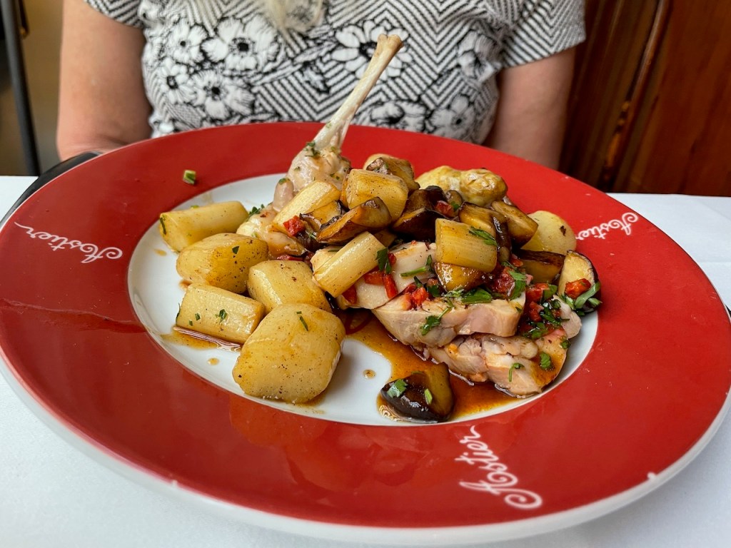 Joanna really enjoyed her dish, but I found my veal to be not as tender as one would anticipate with this cut of meat and the accompanying peas were not cooked quite enough to compensate. All in all, I was a little disappointed in a meal I had been looking forward to for some time. However, this was all made whole when we, having ordered it ahead of time, split the Black Chocolate Souffle with candied Kumbawa (Kaffir LIme) zests. As can often be the case, overall, the meal didn’t quite live up to my expectation, which happens when one compares it to a prior visit, one tinged with an associated memory that likely enhanced that experience. None the less, we got out of there for a 96-Euros ($103) which is a bargain given we had three glasses of wine.