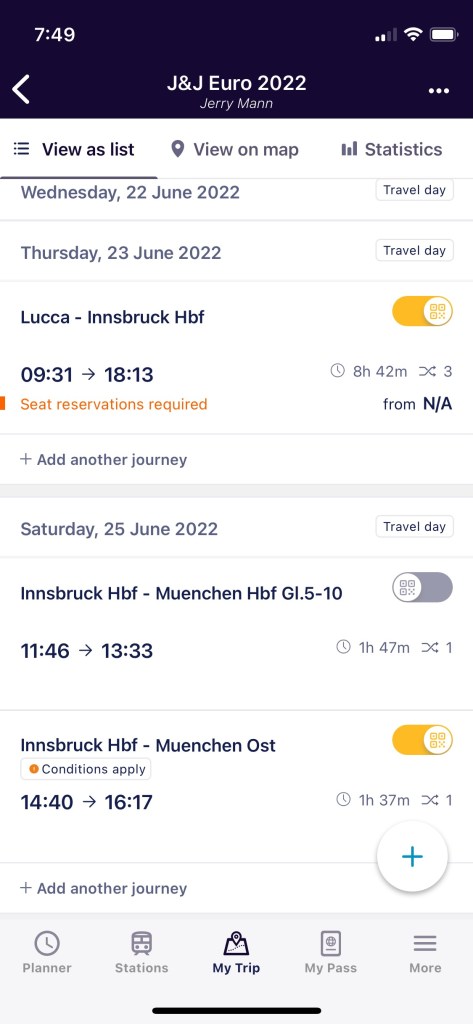 Starting with our journey to Paris this day, we begin our adventure of traveling by rail with the Eurail pass. Although the initial cost of the pass was low, an additional cost comes with the need to purchase a seat reservation for some of the legs of any day’s travel. In reality, during a busy season this is a must anyway as it guarantees you a seat, which we would find out later in the trip when we had to scramble to get seats on crowded days out of Montpellier and Innsbruck. For this leg, it cost us 60-euros ($73) for the two of us, the most it would cost the entire trip for any other reservation.