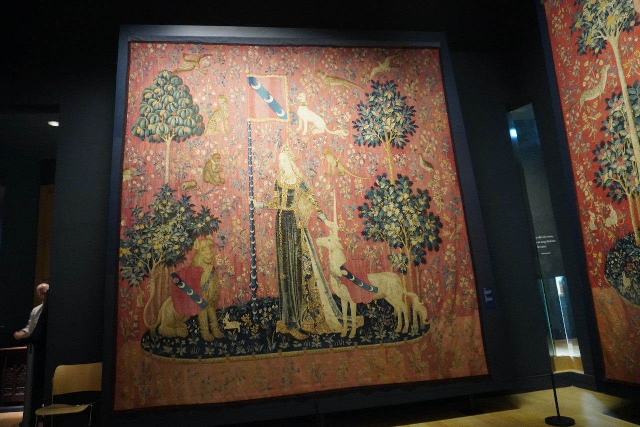 Eventually I found my way to the hall that features the centerpiece of the Museum’s collections. In the 15th century, the opulence of urban elites encouraged artistic production as the demand for art increased. This phenomenon is particularly evident in the considerable rise in demand for tapestries. The most famous tapestries at the Cluny today are that of the Lady and the Unicorn (La Dame à la licorne) series. There are six tapestries that make up this collection, each one representing a different sense. There are the five main senses (smell, hearing, taste, touch, and sight) and it is the sixth tapestry that depicts the Lady with the Unicorn. The mysterious meaning of this sixth has produced multiple interpretations over the years and the most embraced interpretation understands the Lady as representing a sixth sense of morality or spirituality, as she puts aside her worldly wealth.