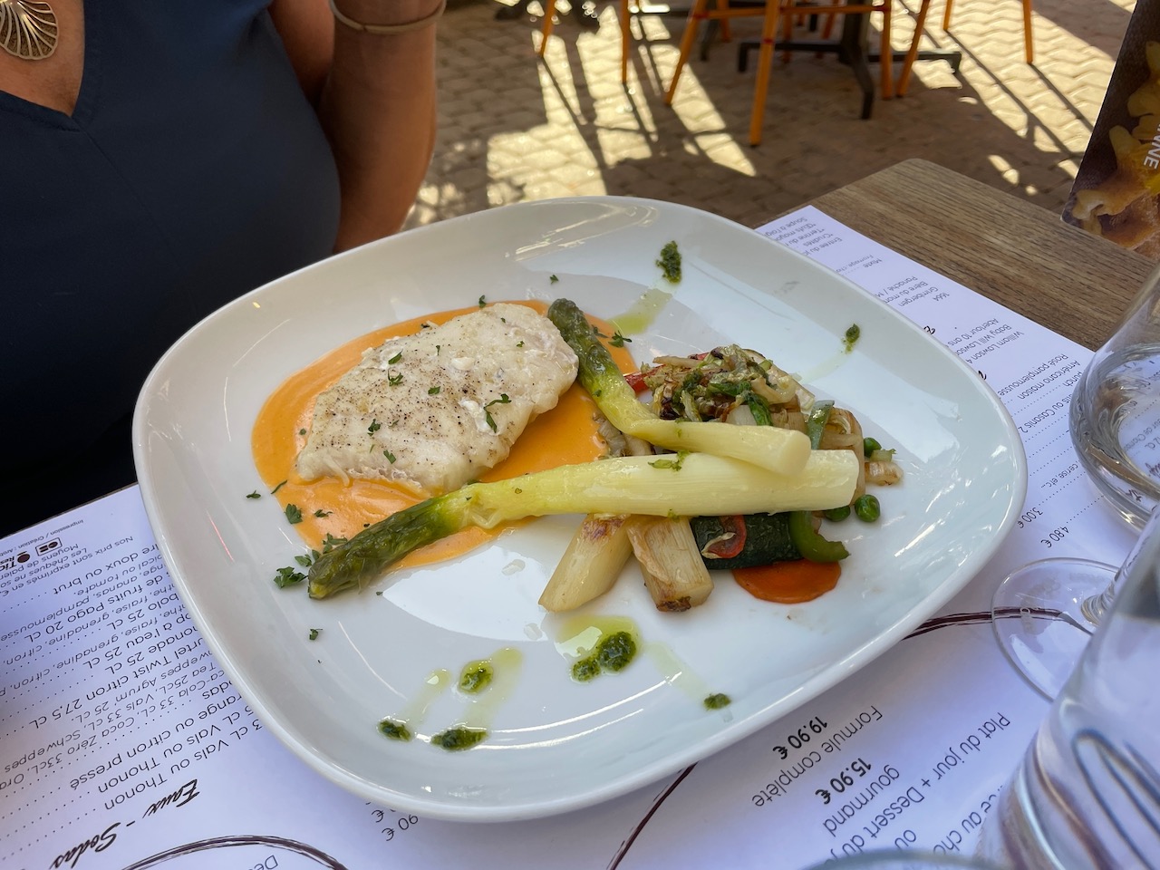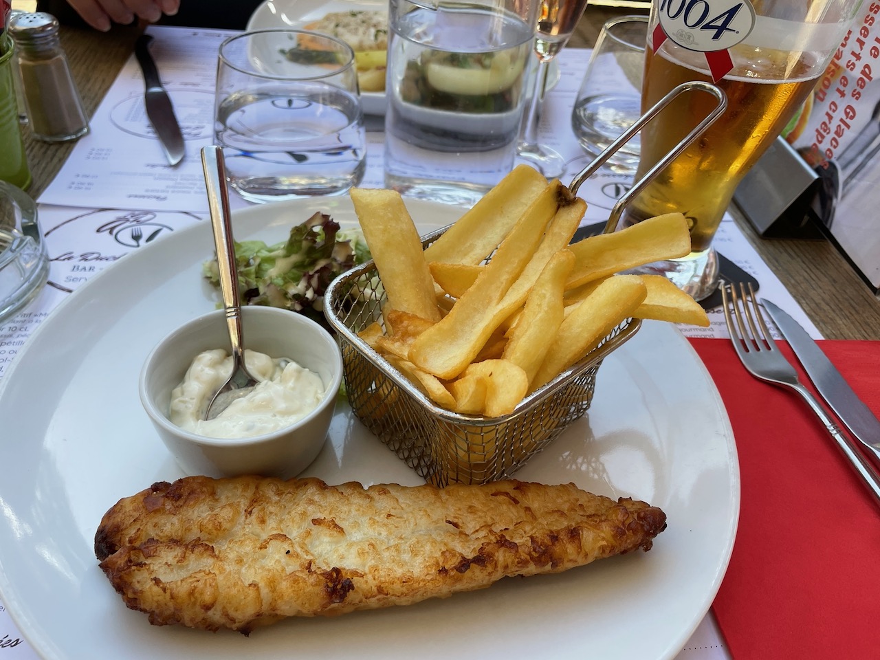 To eat, she would order the Cabillaud (baked cod in a delicate sauce) with white asparagus and for me, the fish and chips. Both dishes were nicely prepared and adequately proportioned, in fact just right for each of us as so often, entrées contain way too much food to consume in one sitting. We would polish off each of our meals and settle the tab at a reasonable 44-Euros ($47), walking back to the hotel to prepare for the next portion of the trip, three days on a rental bike for me (Joanna was to join me before she broke her arm) and Joanna moving from town to town via various forms of public transport. We’ll cover these new adventures starting in the next post.
