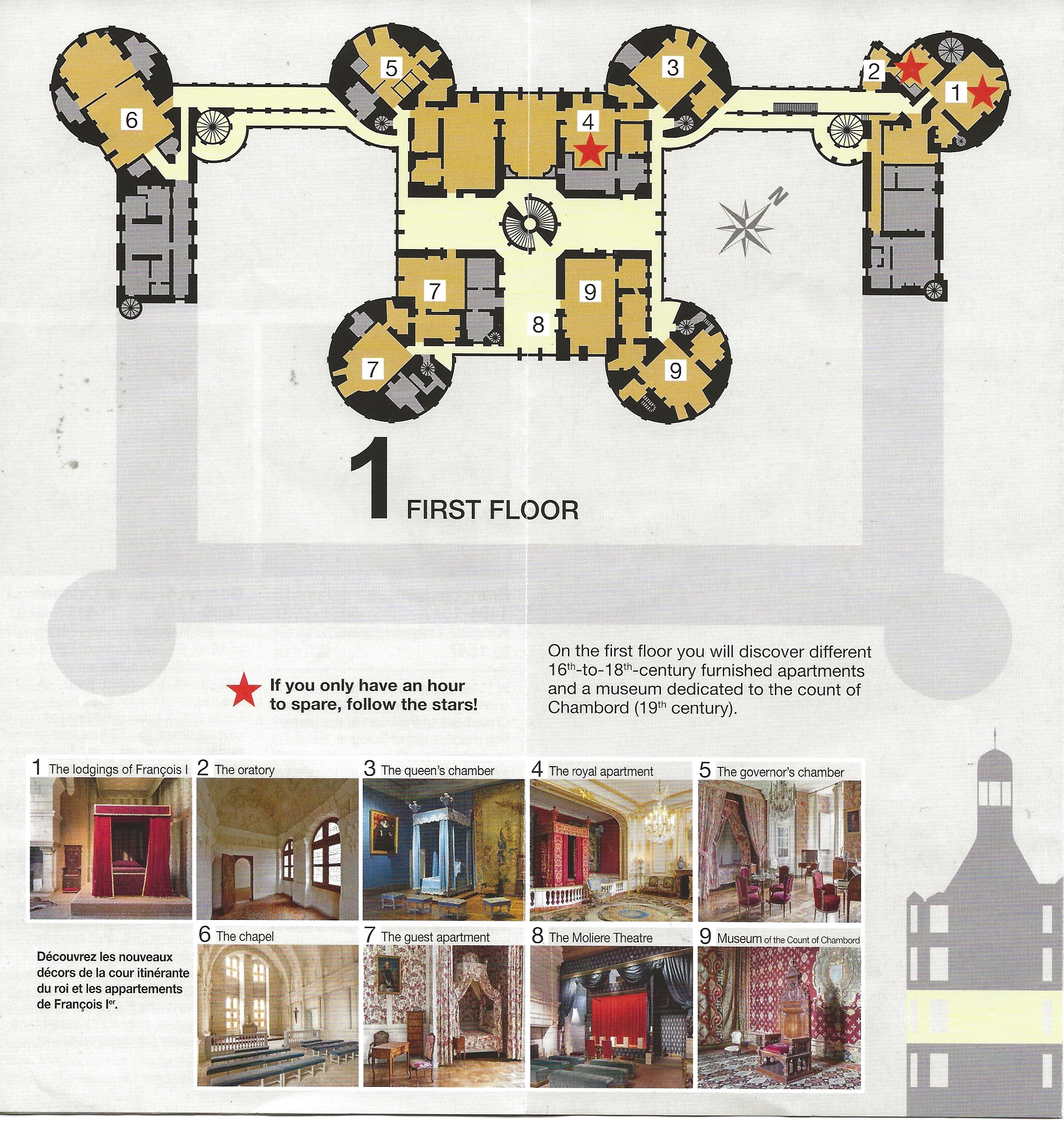 One leaves the ground floor via the staircase to the first floor which contains different 16th to 18th century furnished apartments and a museum dedicated to the count of Chambord (19th century). Here one views the Queen’s chamber, a royal apartment, the governor’s chamber, the Moliere Theatre, and a guest apartment.