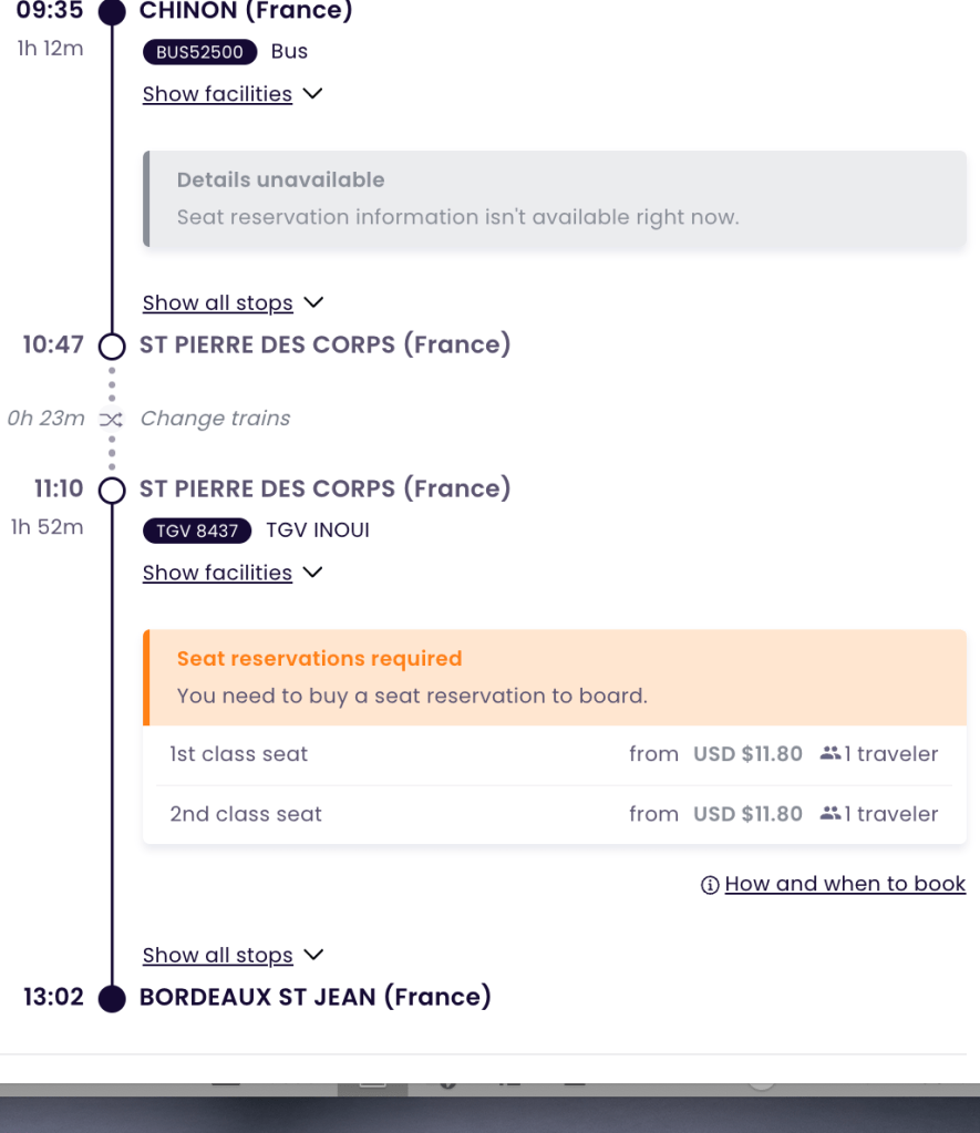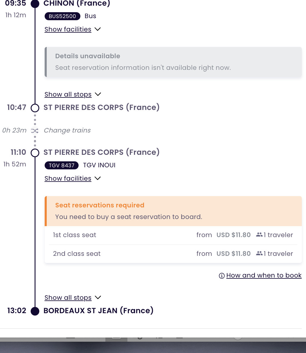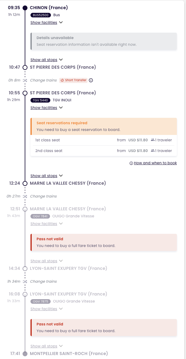 It would require three legs with tight layovers and would take most of the day, proving risky because if we missed a connection, there might not be another train later that day. After checking alternatives, we discovered we could take a two leg with a reasonable layover to Bordeaux, spend the night there and then a direct train to Montpellier.