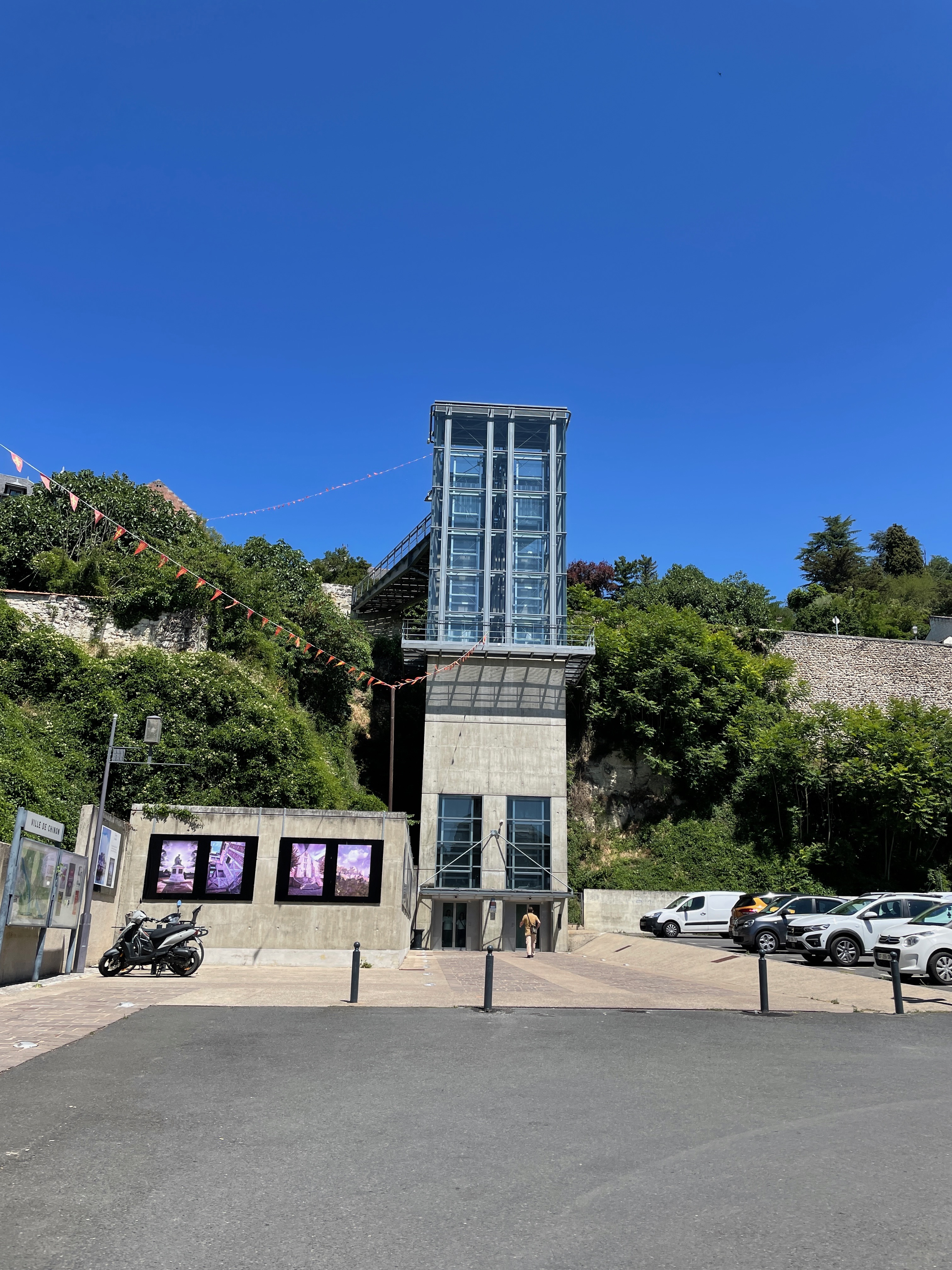 Joanna had already arrived in town, and reunited with time to kill before we could check into the Hotel Diderot, our lodging for the night, we set out to explore that side of the town, whose many narrow streets sit below the town’s historic royal fortress. Henry II (Henry Plantagenet of England), Eleanor of Aquitaine, Richard the Lionheart, and Joan of Arc all called this town home for a while. We entered the main town square and walking through it found an elevator that takes one to the top of the hill where the fortress, in this place since 1044, looks out over the city.