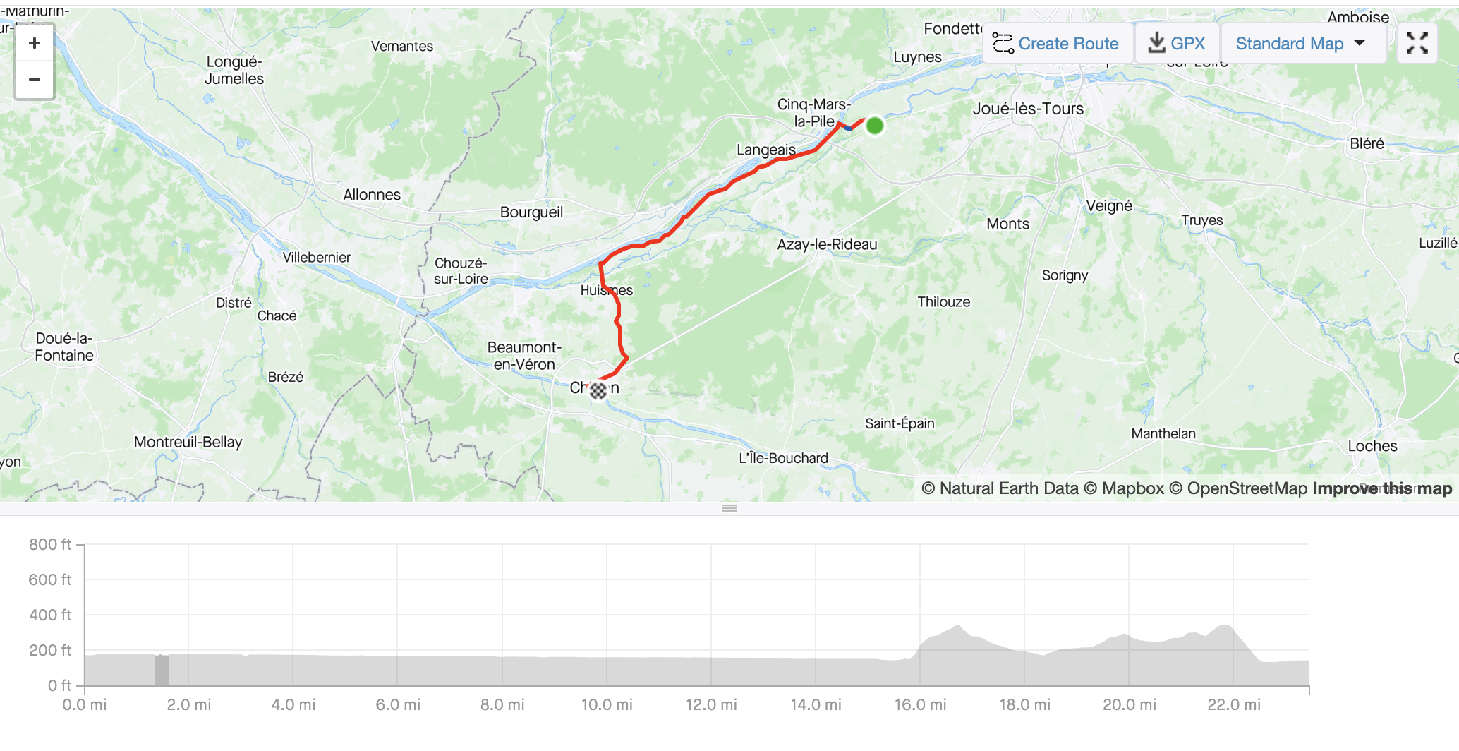 I filled my tank in anticipation of a relatively short day of about 25 miles with very little elevation gain. There would be one tricky section where I had to pay attention to the signage, as I would be leaving the main Loire Valley Cycle Path for an offshoot that would take me into Chinon. As it was a short-day mileage wise, I took my time in order to enjoy the scenery as my good times on the bike would end soon. I did stop midway in a small town for a coffee, sitting beside the river savoring how good life can be sometimes.