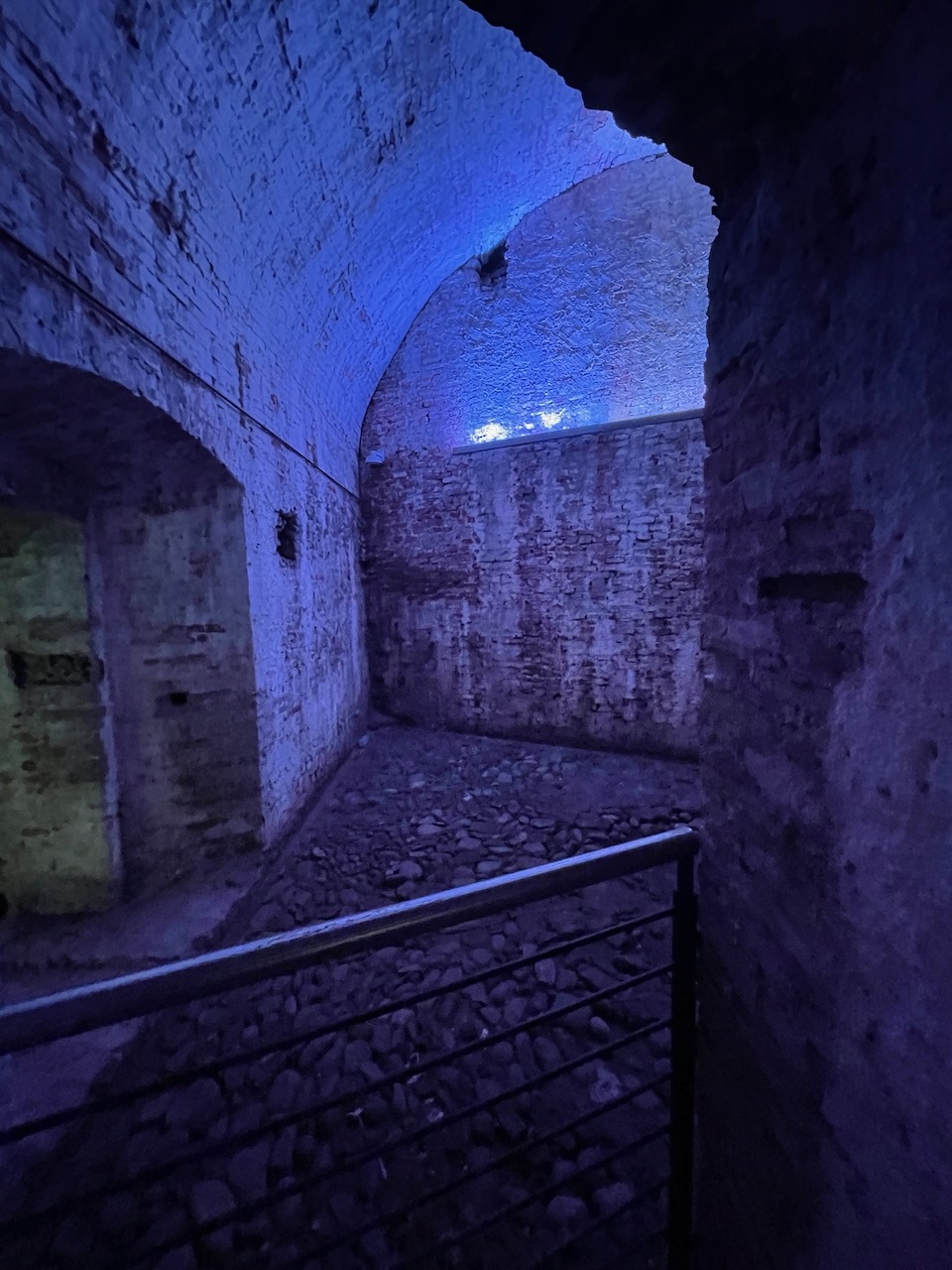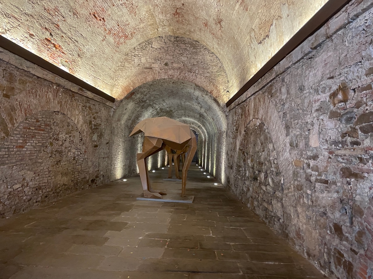 After relaxing at the apartment for a while, we walked the couple of blocks it took us to arrive at Trattoria Da Giulio Surl, where we had made our reservations the day before. The restaurant abuts the outer wall of Lucca and most of the seating is outside. We arrived just as they were opening and as we had a few moments to wait, we walked around the dining area and entered a tunnel that led us into the interior of the wall, which besides allowing one to walk a great distance inside, is also populated here and there with works of art.