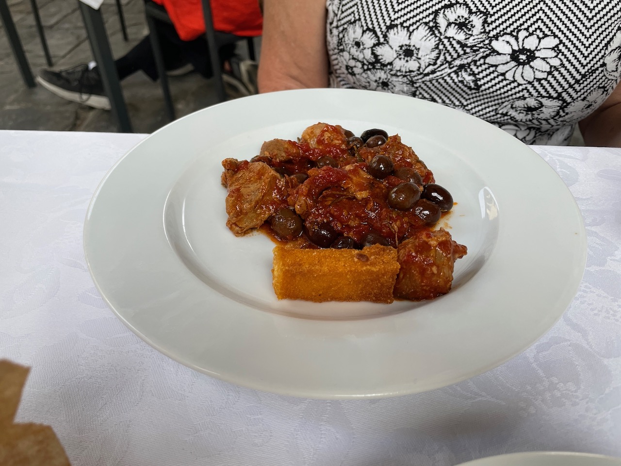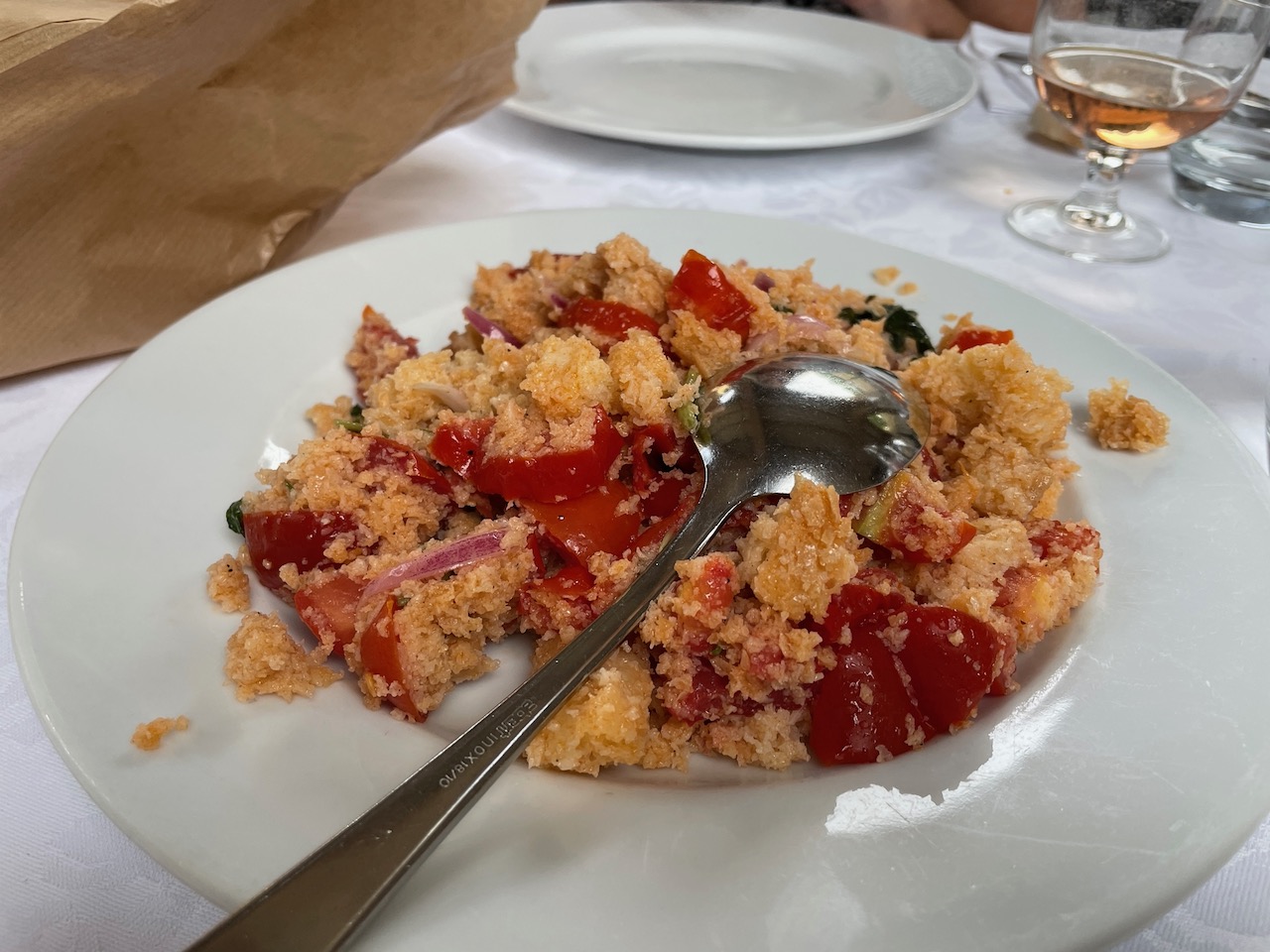 Seated, we ordered an 18-Euro bottle of red wine and after perusing the menu, which we had an English version to view, started with a first course (primo) of the Panzanella, which was very good, the bread soaked appropriately with olive oil, the tomatoes fresh and the red onions providing just the right amount of crisp.