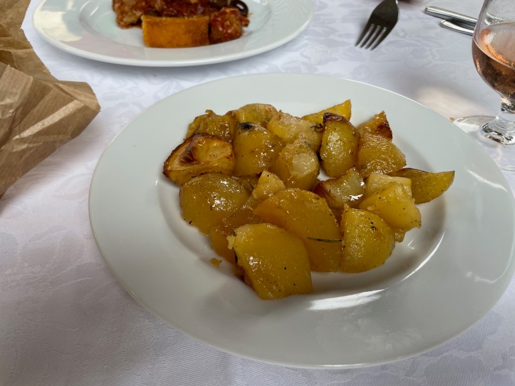 Next up would be our secondo’s and contorno’s (entrees and side dishes as it is all ala-carte here). Joanna ordered the Veal Stew with Olives, and I went with the Veal in Lemon Sauce accompanied by a dish apiece of roasted potatoes and fried vegetables. While it was all mostly good, I was disappointed in my veal as it was overly salty (as was Joanna’s) and the lemon sauce was cloying; I had to scrape most of it off to enjoy the good cut of meat. The roasted potatoes were not up to snuff either as they weren’t really roasted, more like parboiled. But that could have been a local interpretation. Note to self: more local roasted potatoes need to be consumed to continue researching this issue.