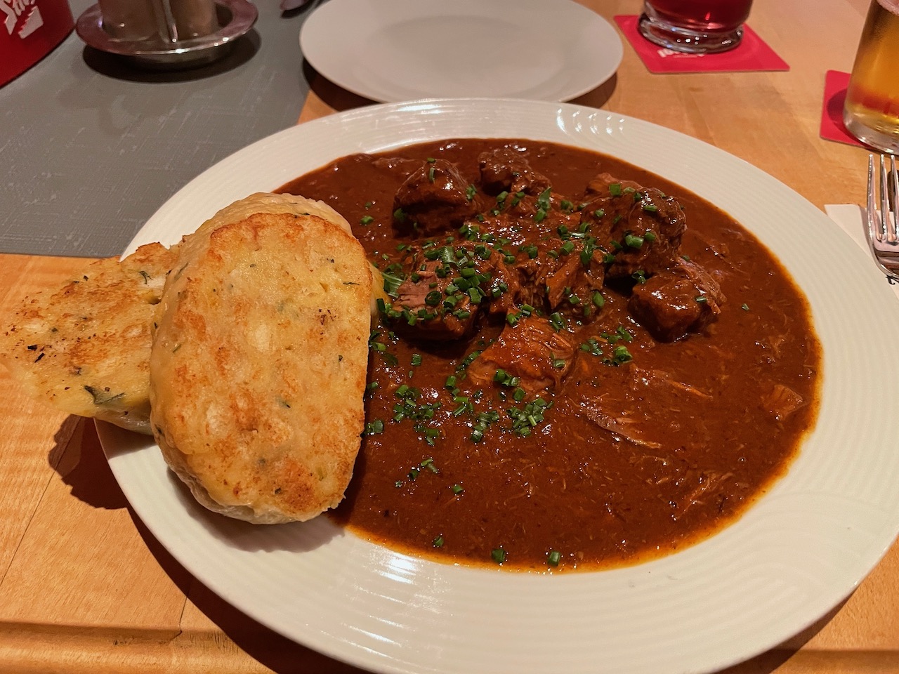These would get us started as we ordered our entrees, the Alt Wiener Saftgulasch (Beef goulash with bread dumplings) for me and the Geräuchertes Forellenfilet auf Salatbouquet (Smoked trout fillet salad) for Joanna.  I also ordered another beer, the Goldbrau to finish off my meal.  The food was excellent and as I have mentioned several times during our accounting of this trip, quite reasonable with the tab coming to just 41.7-Euros ($44.24).