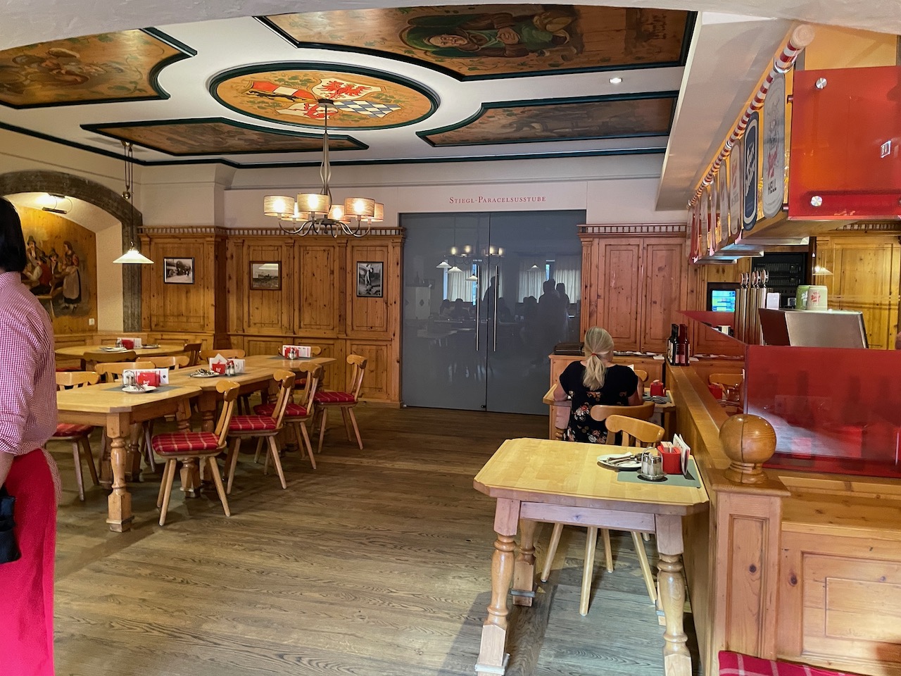 Craving a taste of the food one associates with Austria and German, we located the Stiegl-brau pub just a few blocks away.  Still family owned, Stiegl has been brewing beer in Salzburg since 1492 and remains one of the most popular brews in Austria.  We entered the pub, a renovated fermenting cellar from the year 1937 and were seated at a table for four near the service bar.  A fairly large party, a conference or traveling group, occupied a series of tables nearby and from all appearances, were thoroughly enjoying themselves.