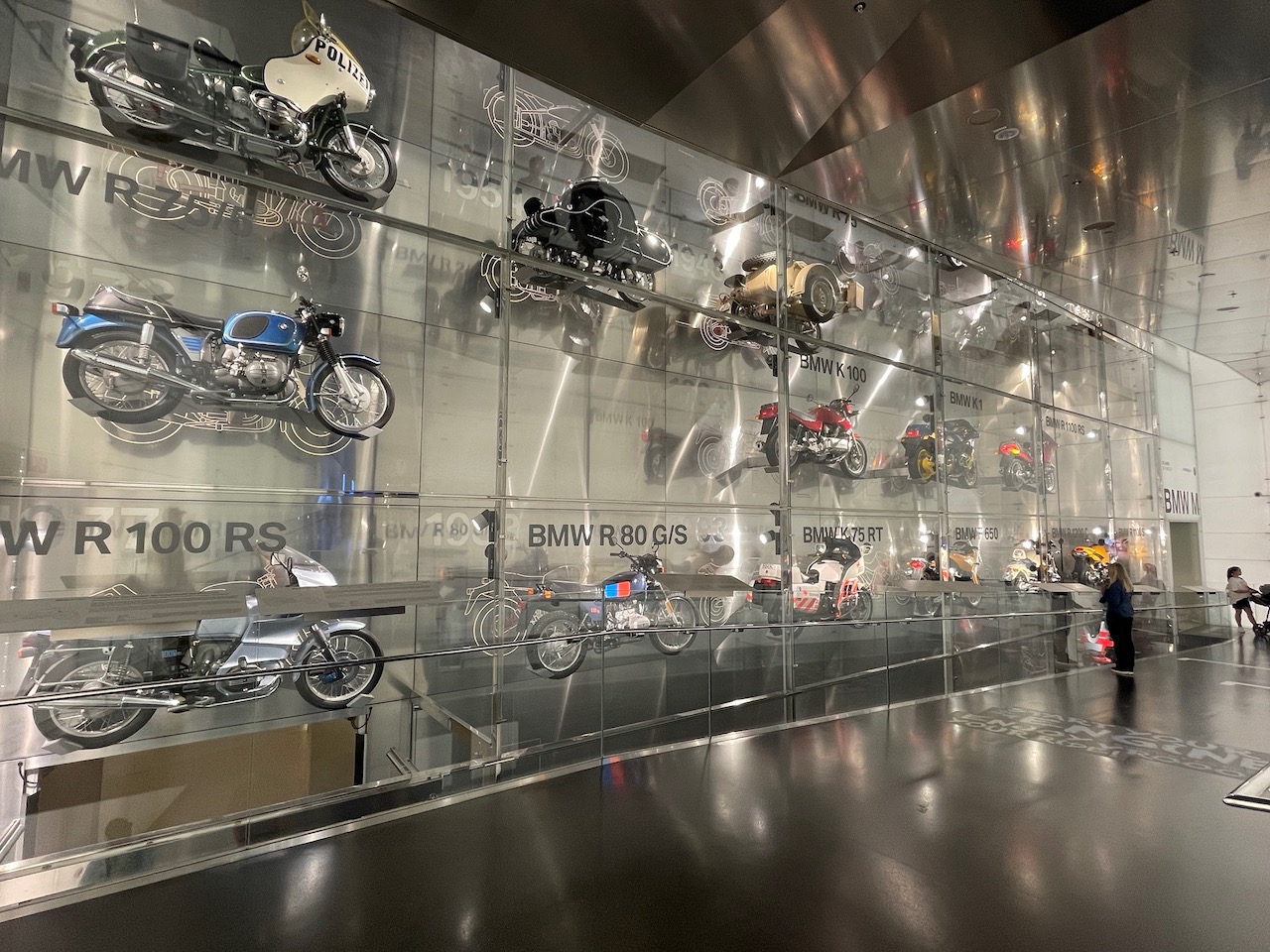 From the first-floor ground level we descended one floor where the focus was on the company’s motorcycles, with a wall that contains almost every model made through its history.