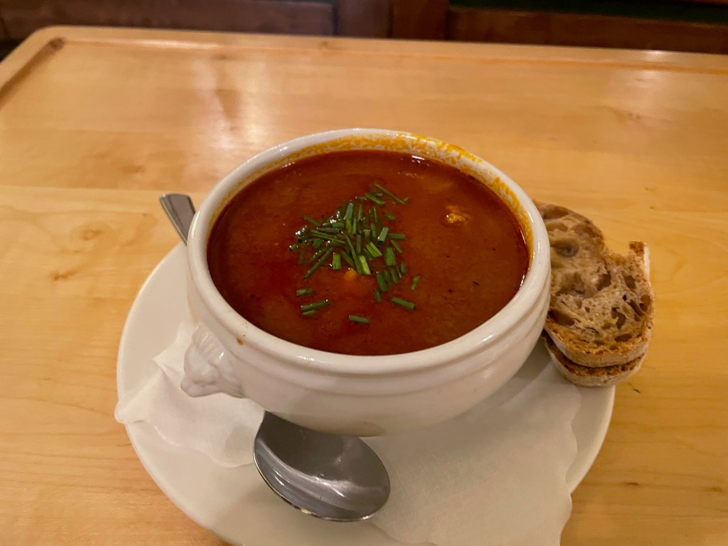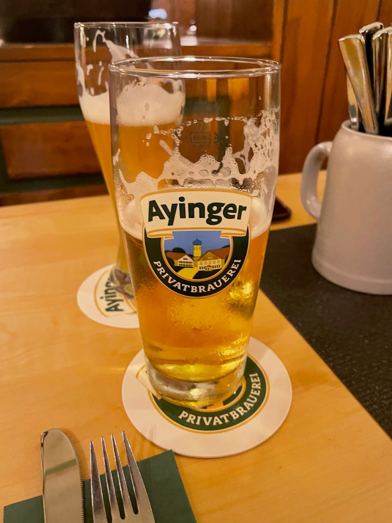Not knowing what to expect, we were pleasantly surprised to see a restaurant interior exactly how you would expect one to look in Germany, particularly in Bavaria, that is, wood paneled walls with artful painting above the panels, tables and booths surrounded by dark wood chairs so characteristic of a Bavarian style. Seated we ordered a beer apiece, an Ayinger Helles for me and their Weissbier for Joanna. Also, even knowing we likely wouldn’t finish all of our food that night, a bowl of Gulaschsuppe to start with.