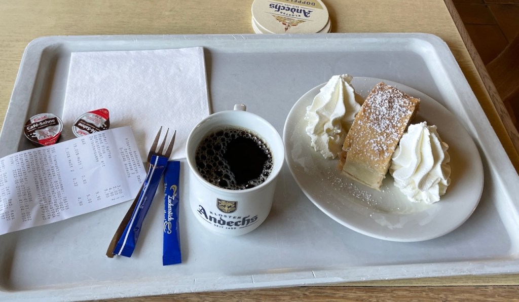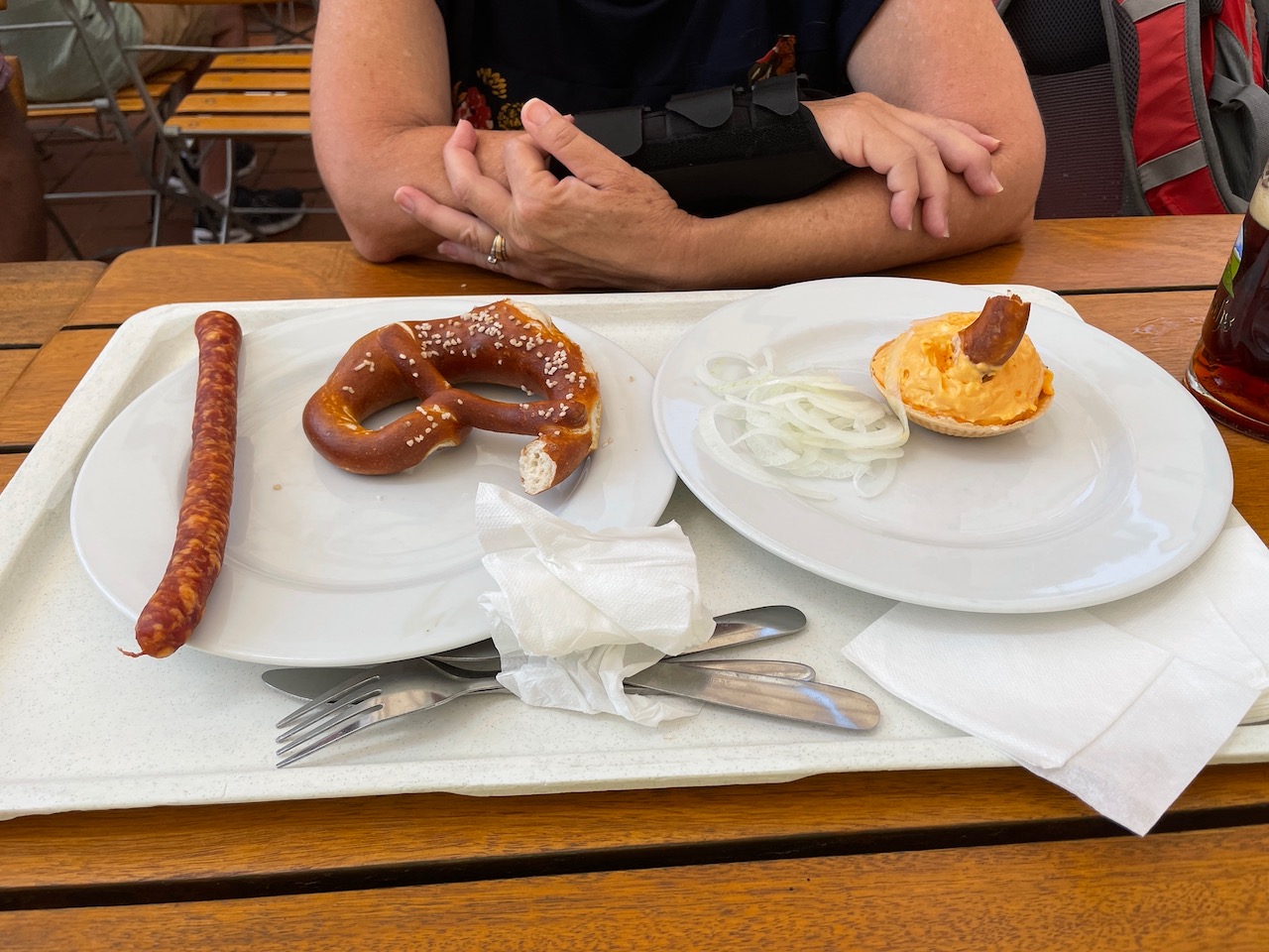 As I was descending, Joanna texted me to let me know she had arrived and after some back and forth, we were able to find each other and head to the Braustuberl (a tavern or pub next to a brewery) for a well-deserved beer and snack. The Monastery has a large biergarten (beer garden) but it was closed as it was a mid-week and so we landed on the patio next to the café where I had enjoyed the strudel.